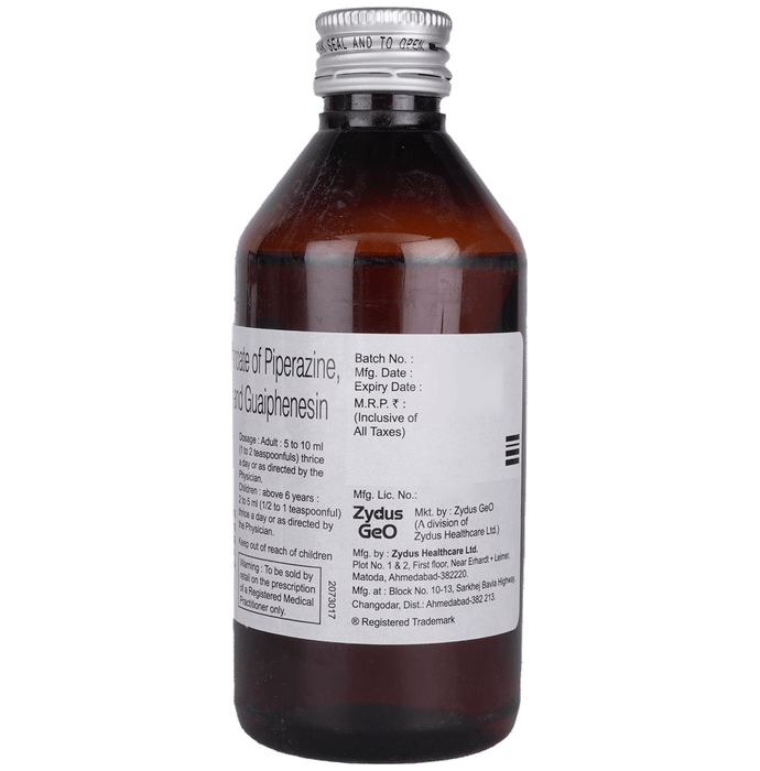 Marketer:Zydus Cadila,Composition:Piperazine (80mg) + Ephedrine (12mg) + Guaifenesin (50mg) + Alcohol (0.55ml), medicine_typedrugs,Packaging Detail:bottle of 200 ml Elixir,          Package:Bottle,Qty:200 ml,Product Form:Elixir, prescription_required:Prescription Required,primary_use: