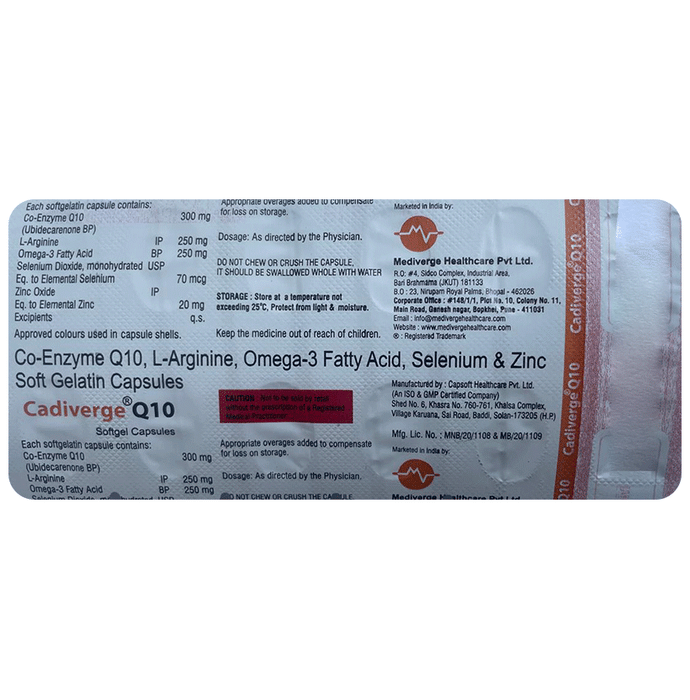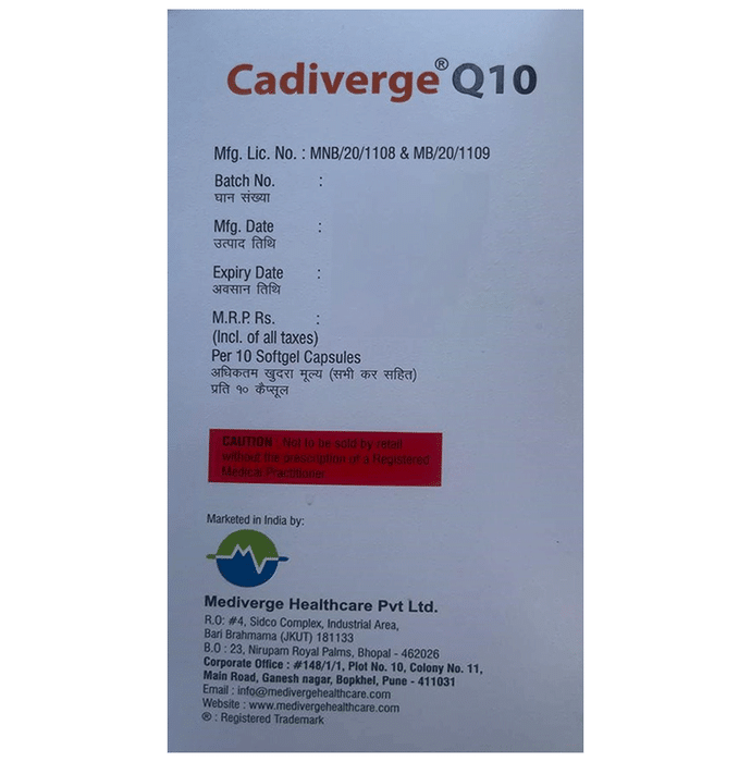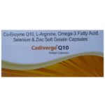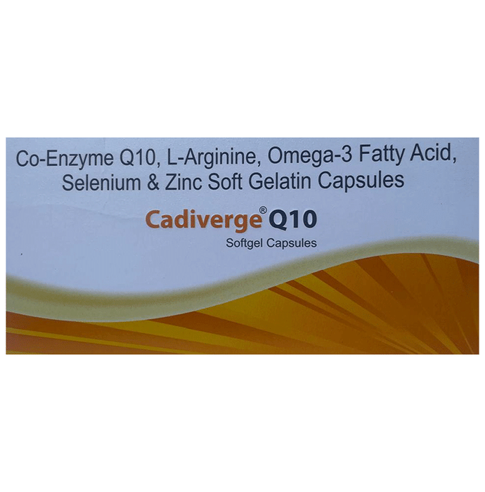 description:Cadiverge Q 10 Softgel Capsule is a prescription medicine which has a combination of medicines that are used in the treatment of nutritional deficiencies. It provides essential nutrients for the proper functioning and growth of the body. Cadiverge Q 10 Softgel Capsule may be taken with or without food. It should be used in the dose and duration as prescribed by your doctor. It is advised to take this medicine at a fixed time.This medicine should not be taken more than the recommended dose. It is usually a safe medicine with very minimal or no side effects. However, if you experience severe diarrhea, vomiting, or constipation, you should consult your doctor without delay.Before taking this medicine, tell your doctor if you have any other health conditions. Inform your doctor if you are taking any other medicines or if you are pregnant or breastfeeding.