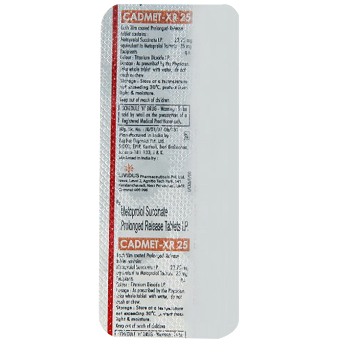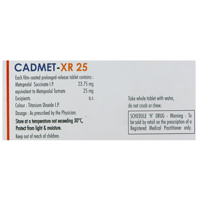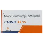 description:Cadmet 25mg Tablet XR belongs to a group of medicines called beta-blockers. It is used to treat high blood pressure (hypertension), angina (heart-related chest pain), and irregular heart rhythms (arrhythmia). It also helps to prevent migraines, future heart attacks, and stroke. Cadmet 25mg Tablet XR may be prescribed alone or together with other medications. The dose and frequency will depend on what you are taking it for and the severity of your condition. It may be taken empty stomach or with a meal, but take it regularly at the same time each day to get the maximum benefit. It may take several weeks before you get the full benefit of this medicine and you may need to take it for the rest of your life. However, it is important to continue taking it even if you feel well. Most people with high blood pressure do not have symptoms if you stop taking it your condition may worsen.The main side effects of Cadmet 25mg Tablet XR are tireness, headache, depression, diarrhea, rash, slow heart rate, feeling dizzy, and nausea. These are usually mild and short-lived. It may also cause shortness of breath or low blood pressure in some people. To reduce the risk of side effects your doctor will probably start the medicine at a low dose and gradually increase it. Consult your doctor if the side effects bother you or do not go away.Before taking it, let your doctor know if you have any liver problems. It may also not be suitable for people who have a slow heart rate, severe circulation problems, severe heart failure, or low blood pressure. Pregnant or breastfeeding mothers should also consult their doctor before taking it. You must talk to your doctor to find out whether this medicine is suitable for you to use. You should have your blood pressure checked regularly to make sure that this medicine is working properly. Avoid drinking alcohol as it may increase certain side effects.