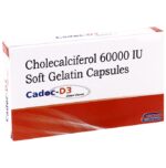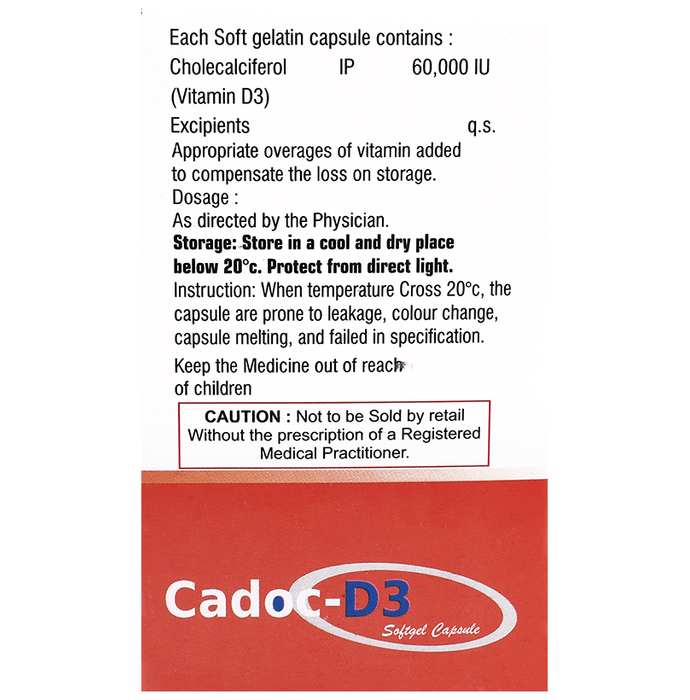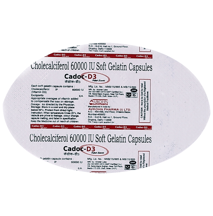 description:Cadoc-D3 SoftgelCapsule is used to treat vitamin D deficiency and osteoporosis. It helps the body absorb calcium, which is essential for maintaining strong and healthy bones. It is used when the diet does not provide enough. Cadoc-D3 SoftgelCapsule should be taken as directed by your doctor. It is best taken with or after food as this helps your body absorb it, and you should take it regularly to get the most benefit. If you are using it to treat osteoporosis, you will also be prescribed other medicines. This medicine may be only part of a complete treatment program that includes making changes to your diet and taking calcium and vitamin supplements. Learn about the foods you should eat to ensure you get enough calcium and vitamin D.Cadoc-D3 SoftgelCapsule has few side effects, and none are common. If you take too much, you may feel weakness, muscle pain, or a metallic taste in your mouth. If you experience any such side effects, speak with your doctor. They may be able to help you reduce or treat the symptoms.Before taking this medicine, tell your doctor if you have high calcium levels in your blood or if you have any heart, kidney, or liver disease. Some other medicines can decrease the absorption of vitamin D3, so let your doctor know all other medicines you are taking to make sure you are safe. This medicine may help during pregnancy when your body needs more vitamin D, but too much could harm your baby. Discuss with your doctor.