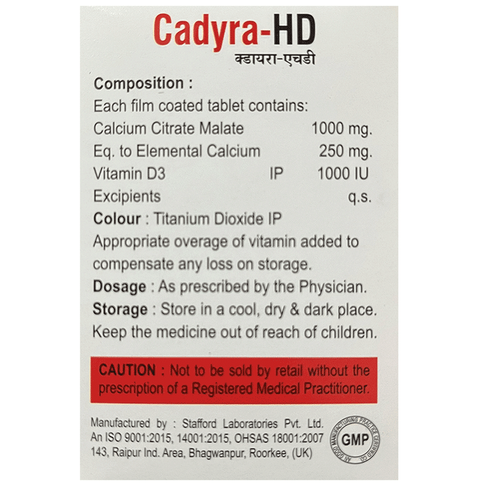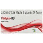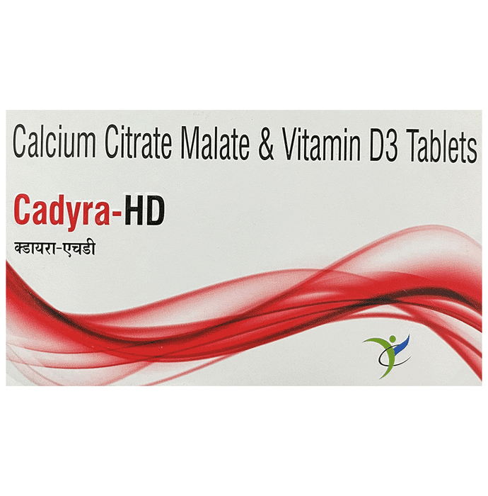description:Cadyra-HD Tablet is a nutritional supplement used in the treatment of calcium deficiency. It is prescribed when your diet alone cannot provide the necessary calcium your body needs. It increases the absorption of calcium and helps to prevent or treat low blood calcium levels. Cadyra-HD Tablet may be taken with or without food. Take it in the dose and duration advised by the doctor. Take it regularly at the same time each day to get maximum benefits from it. Do not take it more than or longer than prescribed by the doctor, as that may cause harmful effects.It may cause constipation and upset stomach in some people. If you experience any such symptoms on taking the medicine, let your doctor know. They may be able to suggest ways to reduce or prevent the side effects. Before taking the medicine, let your doctor know if you have any preexisting medical conditions or if you are taking any other medications. This will ensure your safety to use this medicine.