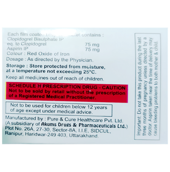 Marketer:Bon Merci Life Sciences,Composition:Aspirin (75mg) + Clopidogrel (75mg), medicine_typedrugs,Packaging Detail:strip of 10 tablets,                   Package:Strip,Qty:10,Product Form:Tablet, prescription_required:Prescription Required,primary_use: