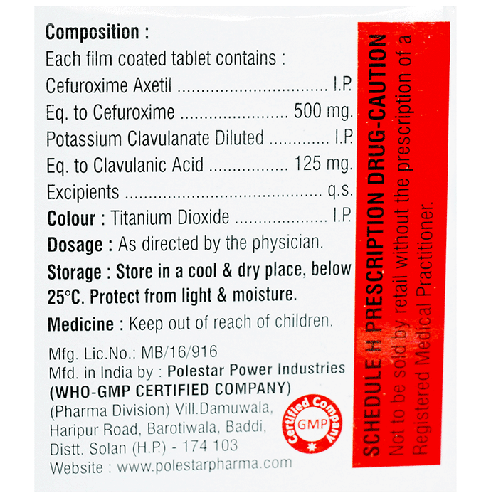 Marketer:Hinduza Life Science Pvt Ltd,Composition:Cefuroxime (500mg) + Clavulanic Acid (125mg), medicine_typedrugs,Packaging Detail:strip of 10 tablets,                   Package:Strip,Qty:10,Product Form:Tablet, prescription_required:Prescription Required,primary_use: