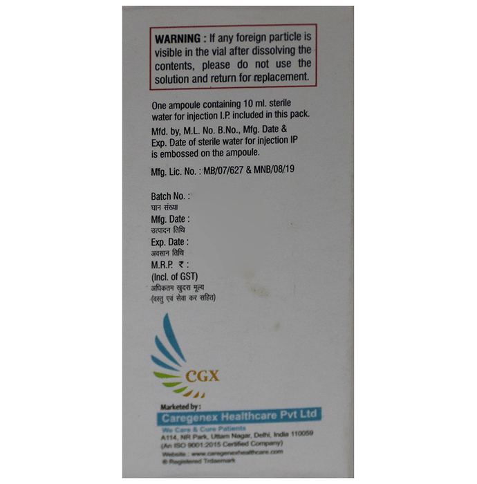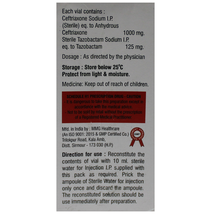 Marketer:Caregenex Healthcare Pvt Ltd,Composition:Ceftriaxone (1000mg) + Tazobactum (125mg), medicine_typedrugs,Packaging Detail:vial of 1 Injection,          Package:Vial,Qty:1,Product Form:Injection, prescription_required:Prescription Required,primary_use: