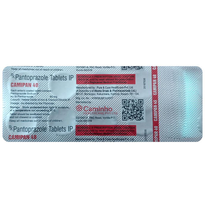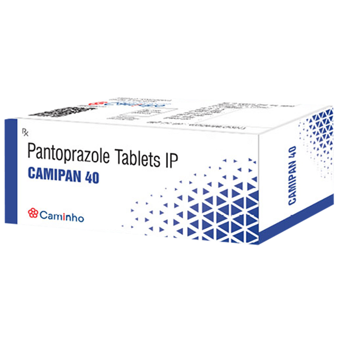 Camipan 40 Tablet is a medicine that reduces the amount of acid produced in your stomach. It is used for treating acid-related diseases of the stomach and intestine such as heartburn, acid reflux, peptic ulcer disease, and Zollinger-Ellison syndrome. It provides relief from the symptoms and promotes healing. Camipan 40 Tablet is also used to prevent stomach ulcers and acidity that may be seen with the prolonged use of painkillers. It belongs to a class of medicines known as proton pump inhibitors (PPIs). This medicine should be taken one hour before a meal, preferably in the morning. The dose will depend on your underlying condition and how you respond to the medicine. You should keep on taking it as prescribed even if your symptoms disappear quickly. You can increase the efficiency of the treatment by eating smaller meals more often and avoiding caffeinated drinks (like tea and coffee), and spicy or fatty foods.The most common side effects observed with this medicine include nausea, vomiting, headache, dizziness, flatulence, diarrhea, and stomach pain. These symptoms are generally mild but if they bother you or do not go away, consult your doctor. Long-term use of this medicine may lead to an increased risk of side effects. For instance, using this medicine for more than 1 year may increase your risk for bone fractures, especially with higher doses. Talk to your doctor about ways to prevent bone loss (osteoporosis), like taking calcium and vitamin D supplements.Before taking this medicine, you need to tell your doctor if you have severe liver problems, are taking medicines for HIV, have ever had an allergic reaction to similar medicines in the past, or suffer from bone loss (osteoporosis). Pregnant or breastfeeding women should also consult their doctor before taking it.