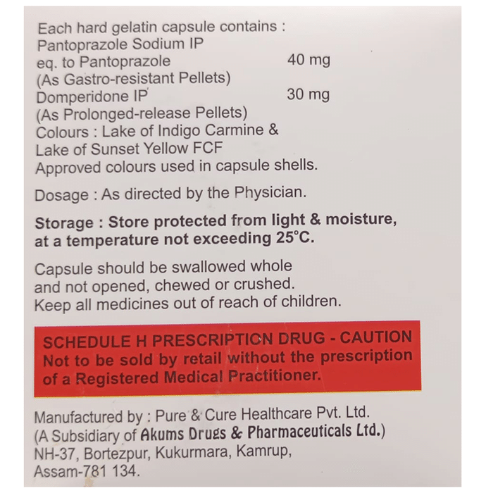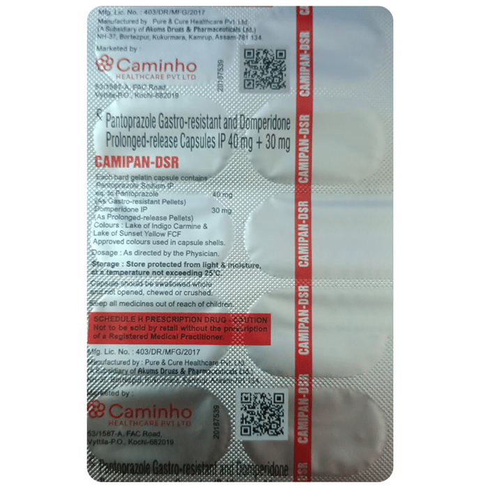 Camipan-DSR Capsule is a prescription medicine used to treat gastroesophageal reflux disease (Acid reflux), dyspepsia (indigestion), and gastritis. It helps treat the conditions by reducing the amount of acid in the stomach thereby relieving symptoms of acidity such as heartburn, stomach pain, or irritation. Camipan-DSR Capsule also neutralizes the acid in the stomach and promotes easy passage of gas to reduce stomach discomfort. It is taken without food in a dose and duration as advised by the doctor. The dose you are given will depend on your condition and how you respond to the medicine. You should keep taking Camipan-DSR Capsule for as long as your doctor recommends. If you stop treatment too early your symptoms may come back and your condition may worsen. Let your healthcare team know about all other medications you are taking as some may affect, or be affected by this medicine.The most common side effects of Camipan-DSR Capsule are diarrhea, vomiting, stomach pain, flatulence, dryness in the mouth, and headache. Most of these are temporary and usually resolve with time. Contact your doctor straight away if you are at all concerned about any of these side effects. This medicine may cause dizziness and sleepiness, so do not drive or do anything that requires mental focus until you know how this medicine affects you. Avoid drinking alcohol while taking Camipan-DSR Capsule as it can worsen your sleepiness. Lifestyle modifications like having cold milk and avoiding hot tea, coffee, spicy food, or chocolate can help you to get better results.Before you start taking this medicine it is important to inform your doctor if you are suffering from kidney or liver disease. You should also tell your doctor if you are pregnant, planning pregnancy, or breastfeeding.