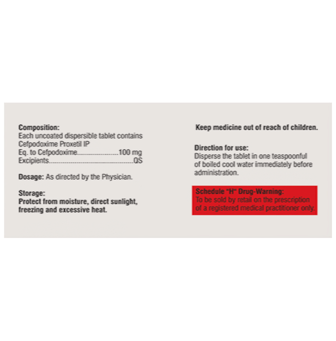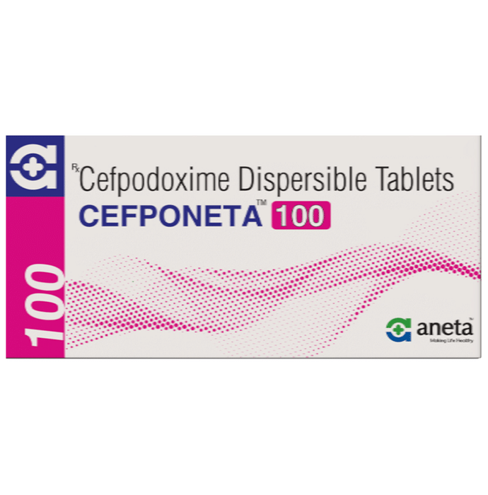 Cefponeta 100 Tablet DT is an antibiotic medicine used to treat bacterial infections in your body. It is effective in infections of the lungs (eg. pneumonia), urinary tract, ear, nasal sinus, throat, and skin. It kills bacteria, which helps to improve your symptoms and cure the infection. Cefponeta 100 Tablet DT should be taken with food. You should take it regularly at evenly spaced intervals as per the schedule prescribed by your doctor. Taking it at the same time every day will help you to remember to take it. The dose will depend on what you are being treated for, but you should always complete a full course of this antibiotic as prescribed by your doctor. Do not stop taking it until you have finished, even when you feel better. If you stop taking it early, some bacteria may survive and the infection may come back. It will not work for viral infections such as flu or the common cold. Using any antibiotic when you do not need it can make it less effective for future infections.The most common side effects of this medicine include rash, nausea, and diarrhea. Taking this medicine along with some food may help to prevent indigestion and upset stomach. Consult your doctor if you find these side effects bother or worry you. Before using it, you should tell your doctor if you are allergic to any antibiotics or have any kidney or liver problems. This medicine is generally regarded as safe to use in pregnancy and breastfeeding if prescribed by your doctor. It may blur your vision or make you feel sleepy and dizzy. Do not drive if these symptoms occur.
