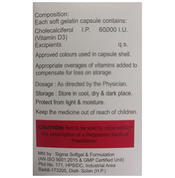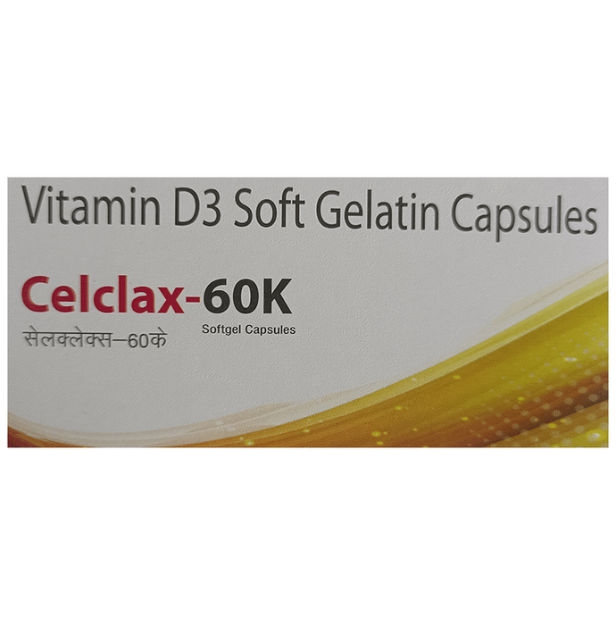 Celclax 60K Softgel Capsule is used to treat vitamin D deficiency and osteoporosis. It helps the body absorb calcium, which is essential for maintaining strong and healthy bones. It is used when the diet does not provide enough. Celclax 60K Softgel Capsule should be taken as directed by your doctor. It is best taken with or after food as this helps your body absorb it, and you should take it regularly to get the most benefit. If you are using it to treat osteoporosis, you will also be prescribed other medicines. This medicine may be only part of a complete treatment program that includes making changes to your diet and taking calcium and vitamin supplements. Learn about the foods you should eat to ensure you get enough calcium and vitamin D.Celclax 60K Softgel Capsule has few side effects, and none are common. If you take too much, you may feel weakness, muscle pain, or a metallic taste in your mouth. If you experience any such side effects, speak with your doctor. They may be able to help you reduce or treat the symptoms.Before taking this medicine, tell your doctor if you have high calcium levels in your blood or if you have any heart, kidney, or liver disease. Some other medicines can decrease the absorption of vitamin D3, so let your doctor know all other medicines you are taking to make sure you are safe. This medicine may help during pregnancy when your body needs more vitamin D, but too much could harm your baby. Discuss with your doctor.