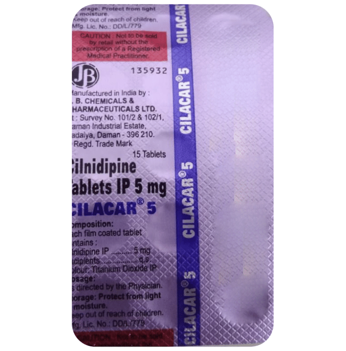 Cilacar 5 Tablet is a medicine used to treat high blood pressure (hypertension). It belongs to a class of medicines known as a calcium channel blocker which helps to lower blood pressure. This helps prevent heart attacks and strokes. It may also be prescribed to prevent angina (heart-related chest pain). Cilacar 5 Tablet may be prescribed alone or along with other medicines. The dose depends on the severity of your condition. You can take it at any time of day, with or without food, but it is best to take it at the same time each day.  Keep taking it for as long as advised by your doctor. Do not stop this medicine on your own, even if you feel well because high blood pressure often has no symptoms. This makes it hard to identify any sudden spike and if you stop taking it, your condition may get worse.Keeping active with regular exercise, reducing your weight, and eating a healthy diet will also help control your blood pressure. Follow your doctor’s advice while taking this medicine.The most common side effects include fatigue, edema (swelling in the feet), sleepiness, dizziness, flushing, unusual beating of the heart (palpitations), and headache. Consult your doctor if any of these bother you, or do not go away. Side effects like swelling in the feet or ankles and palpitations are lesser in severity than other similar medicines of the group. Studies have shown that it also has a protective effect on the kidneys.Before taking it, let your doctor know if you have any liver, kidney, or heart problems. Pregnant or breastfeeding women should also consult their doctor for advice before taking this medicine. You also need to tell your doctor what other medicines you are taking, especially those used to treat high blood pressure or heart conditions. You should have your blood pressure checked regularly to make sure that this medicine is working properly.
