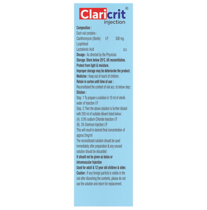 Claricrit 500mg Injection is an antibiotic used to treat various types of bacterial infections. It is effective in most infections of the respiratory tract, ear, nose, throat, lungs, and skin. It is also effective against some infections seen in people with reduced immunity. Claricrit 500mg Injection is also effective against some infections (e.g., MAC or Mycobacterium avium complex) seen in people with reduced immunity. It stops the bacteria from growing, which helps to resolve your symptoms and cure your infection. This medicine is taken orally, preferably either one hour before or 2 hours after a meal. No antacids should be taken within 2 hours of taking this medicine. It should be used regularly at evenly spaced time intervals as prescribed by your doctor. Do not skip any doses and finish the full course of treatment even if you feel better. Stopping the medicine too early may lead to the infection returning or worsening.Common side effects with this medicine include diarrhea, nausea, abnormal taste, indigestion, abdominal pain, headache, vomiting, and rash. These are usually temporary and subside with the completion of treatment. Consult your doctor if you find these side effects do not resolve or persist for a longer duration.Inform your doctor if you have any previous history of allergy or heart problems before taking this medicine. Pregnant or breastfeeding women should consult their doctor before using this medicine.