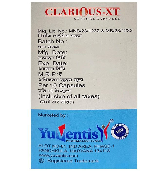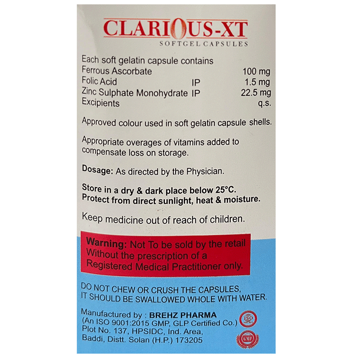 Clarious-XT Softgel Capsule has a combination of medicines which is used in the treatment of iron deficiency. It works by replenishing the iron stores in your body and corrects iron deficiency (anemia) by enhancing the absorption of iron in the body. It also helps in the formation of red blood cells. Clarious-XT Softgel Capsule can be taken with or without food. Intake of dairy products with this medicine should be avoided. It should be used in the dose and duration as prescribed by your doctor. This medicine should not be consumed more than the recommended dose.This is usually a safe medicine with very minimal side effects. Some of the most common side effects of this medicine may be dark-colored stools or stomach upset. Contact your doctor immediately if you notice any symptoms of allergic reactions like swelling, itching, difficulty in breathing, hives, etc.Before taking this medicine, tell your doctor if you have any other health conditions. Inform your doctor if you are taking any other medicines or if you are pregnant or breastfeeding. It is advised not to consume alcohol after taking this medicine.