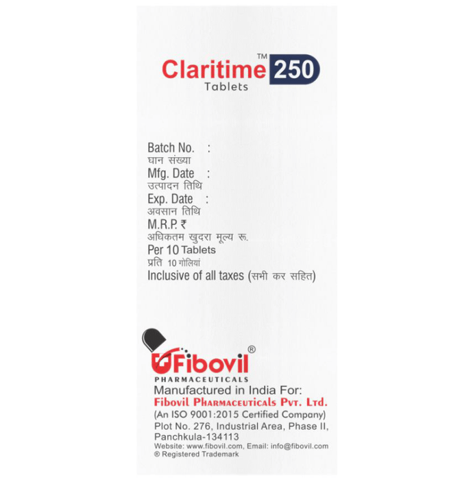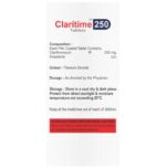 Claritime 250 Tablet is an antibiotic used to treat various types of infections. It is effective in most infections of the respiratory tract, ear, nose, throat, lungs, and skin. It is also effective against a bacteria known as H. pylori, which is associated with peptic ulcer disease. Claritime 250 Tablet is also effective against some infections (e.g., MAC or Mycobacterium avium complex) seen in people with reduced immunity. It stops the bacteria from growing, which helps to resolve your symptoms and cure your infection. This medicine is taken orally, preferably either one hour before or 2 hours after a meal. No antacids should be taken within 2 hours of taking this medicine. It should be used regularly at evenly spaced time intervals as prescribed by your doctor. Do not skip any doses and finish the full course of treatment even if you feel better. Stopping the medicine too early may lead to the infection returning or worsening.Common side effects with this medicine include diarrhea, nausea, indigestion, abdominal pain, headache, vomiting, and rash. These are usually temporary and subside with the completion of treatment. Consult your doctor if you find these side effects do not resolve or persist for a longer duration.Inform your doctor if you have any previous history of allergy or heart problems before taking this medicine. Pregnant or breastfeeding women should consult their doctor before using this medicine.