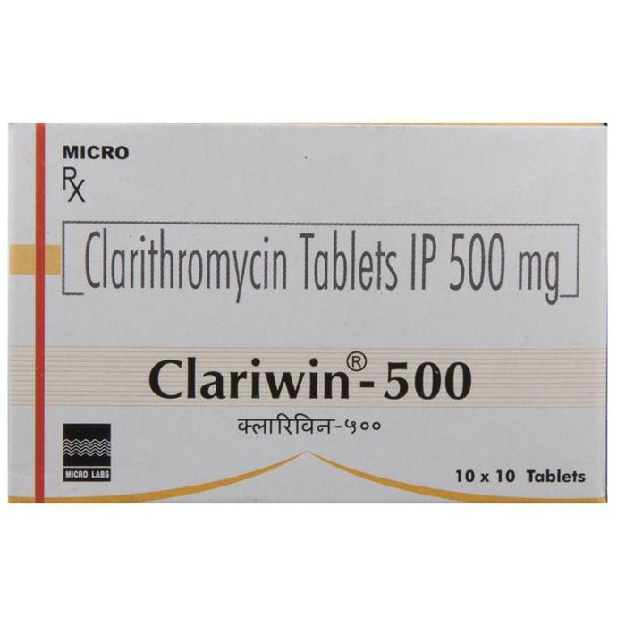 Clariwin 500 Tablet is an antibiotic used to treat various types of infections. It is effective in most infections of the respiratory tract, ear, nose, throat, lungs, and skin. It is also effective against a bacteria known as H. pylori, which is associated with peptic ulcer disease. Clariwin 500 Tablet is also effective against some infections (e.g., MAC or Mycobacterium avium complex) seen in people with reduced immunity. It stops the bacteria from growing, which helps to resolve your symptoms and cure your infection. This medicine is taken orally, preferably either one hour before or 2 hours after a meal. No antacids should be taken within 2 hours of taking this medicine. It should be used regularly at evenly spaced time intervals as prescribed by your doctor. Do not skip any doses and finish the full course of treatment even if you feel better. Stopping the medicine too early may lead to the infection returning or worsening.Common side effects with this medicine include diarrhea, nausea, indigestion, abdominal pain, headache, vomiting, and rash. These are usually temporary and subside with the completion of treatment. Consult your doctor if you find these side effects do not resolve or persist for a longer duration.Inform your doctor if you have any previous history of allergy or heart problems before taking this medicine. Pregnant or breastfeeding women should consult their doctor before using this medicine.