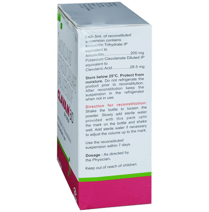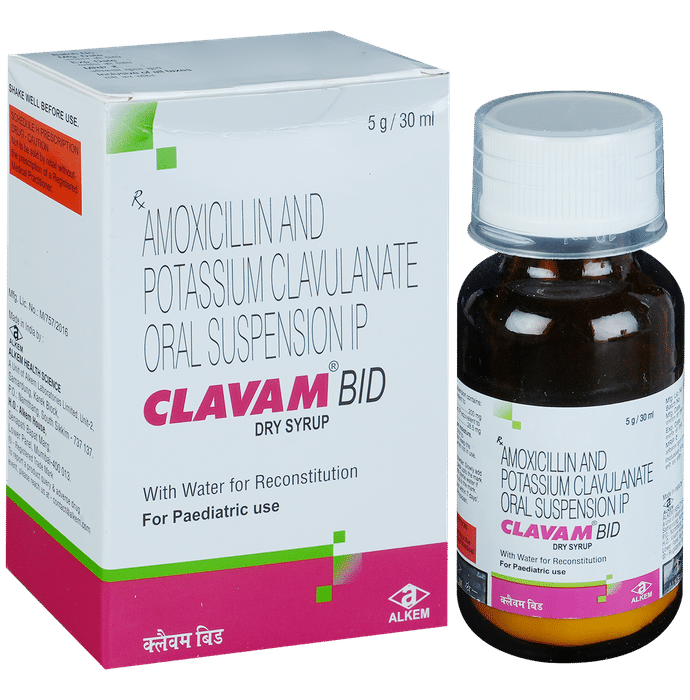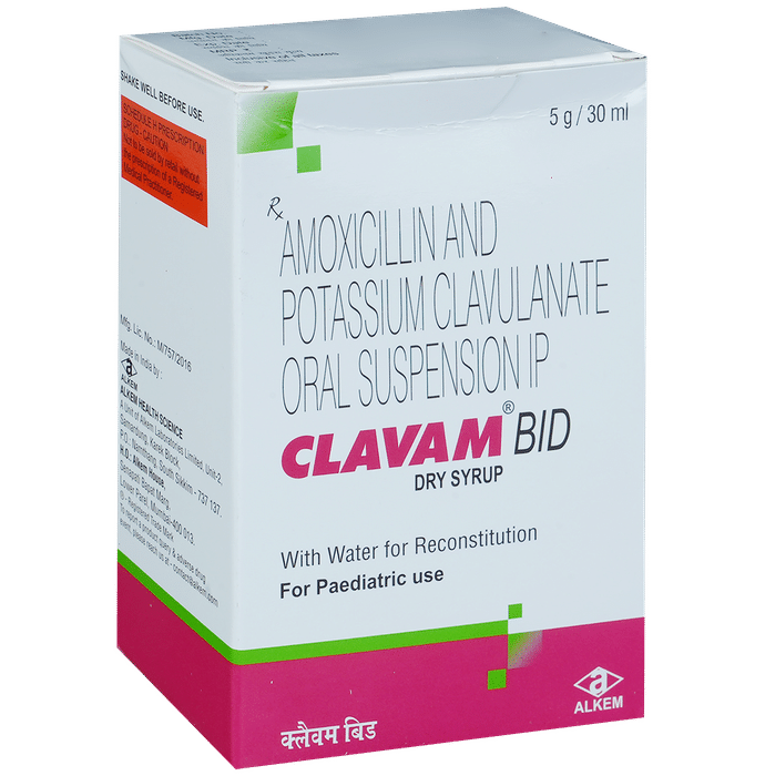 Clavam BID Dry Syrup is an antibiotic medicine that helps treat bacterial infections of the ear, nose, throat, chest, lungs, teeth, skin, and urinary tract. It is capable of killing bacteria that have become resistant to other therapies and thus also helps treat tuberculosis that is resistant to other treatments. You can give Clavam BID Dry Syrup to your child with or without food. It is better to give it with food as that helps increase absorption and decrease the risk of stomach upset. The doctor may prescribe giving it two to three times a day. Medicine dose depends on the severity of the infection, its type, and your child’s body weight and age. So, stick to the dose, time, and way prescribed. If your child vomits the medicine within 30 minutes of intake, let the child calm down and repeat the dose. Do not double dose if it’s the time for the next dose.Clavam BID Dry Syrup may cause vomiting, diarrhea, nausea, abdominal pain, and allergy. These side effects should diminish on their own. But, in case they persist or start bothering your child, you must not delay speaking to your child’s doctor. Share your child’s entire medical history with the doctor, including any previous episode of allergy, heart problem, blood disorder, birth defects, airway obstruction, lung anomaly, gastrointestinal problem, skin disorder, liver impairment, and kidney malfunction. This information will assist the doctor in making dose alterations and for planning your child’s overall treatment.