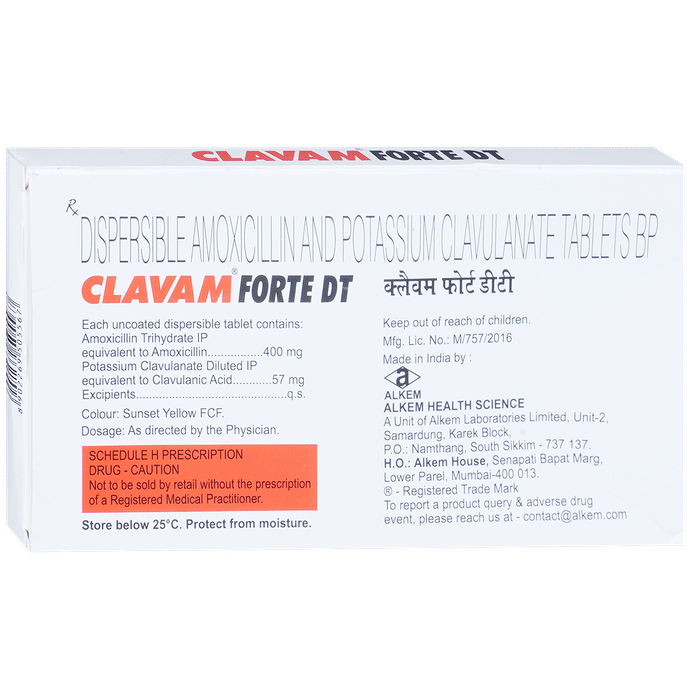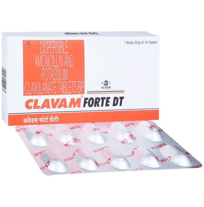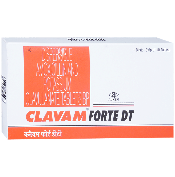 Clavam Forte DT Tablet is an antibiotic medicine that helps treat bacterial infections of the ear, nose, throat, chest, lungs, teeth, skin, and urinary tract. It is capable of killing bacteria that have become resistant to other therapies and thus also helps treat tuberculosis that is resistant to other treatments. You can give Clavam Forte DT Tablet to your child with or without food. It is better to give it with food as that helps increase absorption and decrease the risk of stomach upset. The doctor may prescribe giving it two to three times a day. Medicine dose depends on the severity of the infection, its type, and your child’s body weight and age. So, stick to the dose, time, and way prescribed. If your child vomits the medicine within 30 minutes of intake, let the child calm down and repeat the dose. Do not double dose if it’s the time for the next dose.Clavam Forte DT Tablet may cause vomiting, diarrhea, nausea, abdominal pain, and allergy. These side effects should diminish on their own. But, in case they persist or start bothering your child, you must not delay speaking to your child’s doctor.Share your child’s entire medical history with the doctor, including any previous episode of allergy, heart problem, blood disorder, birth defects, airway obstruction, lung anomaly, gastrointestinal problem, skin disorder, liver impairment, and kidney malfunction. This information will assist the doctor in making dose alterations and for planning your child’s overall treatment.