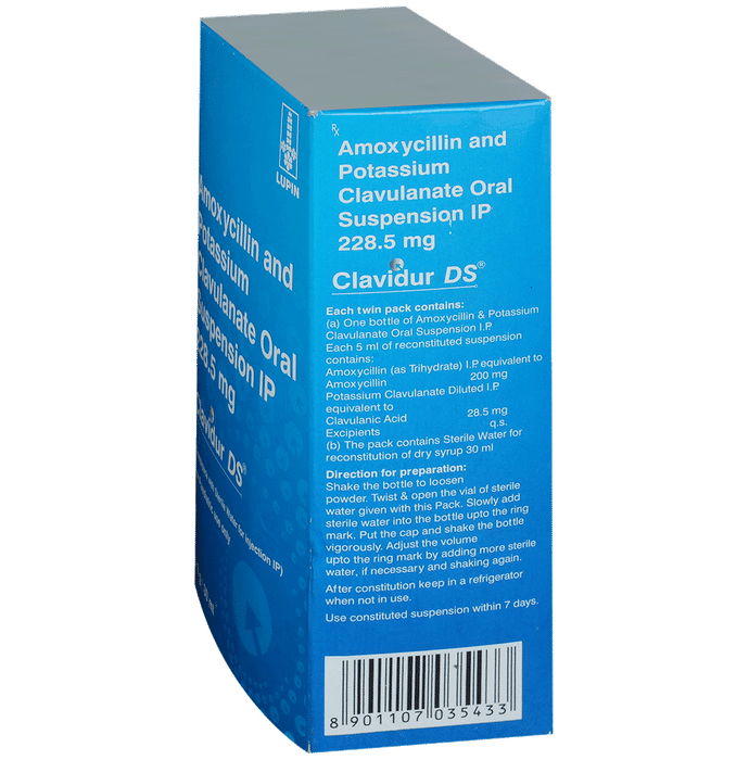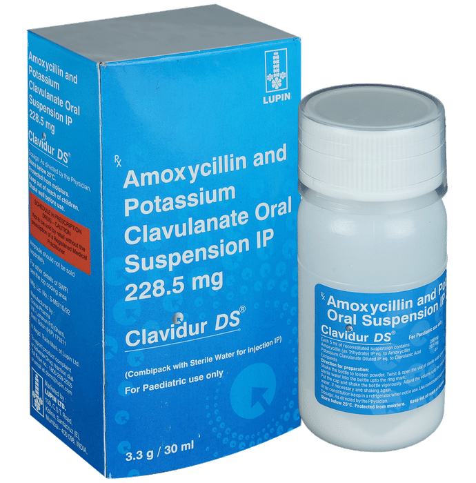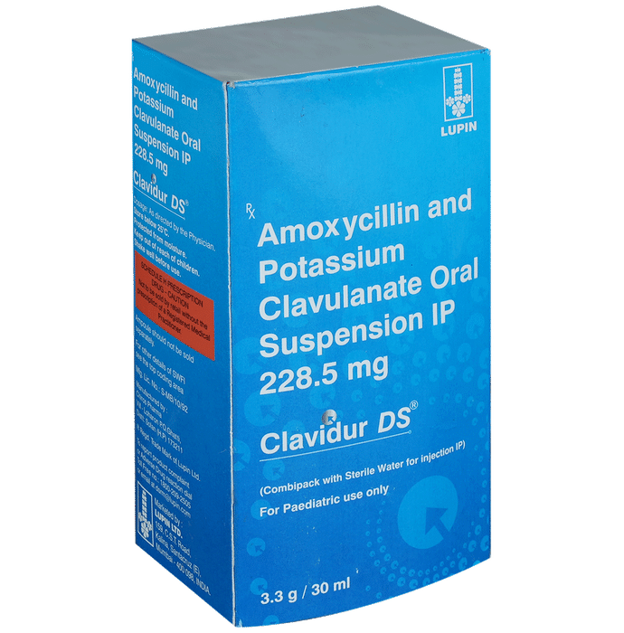 Clavidur DS Syrup is an antibiotic medicine that helps treat bacterial infections of the ear, nose, throat, chest, lungs, teeth, skin, and urinary tract. It is capable of killing bacteria that have become resistant to other therapies and thus also helps treat tuberculosis that is resistant to other treatments. You can give Clavidur DS Syrup to your child with or without food. It is better to give it with food as that helps increase absorption and decrease the risk of stomach upset. The doctor may prescribe giving it two to three times a day. Medicine dose depends on the severity of the infection, its type, and your child’s body weight and age. So, stick to the dose, time, and way prescribed. If your child vomits the medicine within 30 minutes of intake, let the child calm down and repeat the dose. Do not double dose if it’s the time for the next dose.Clavidur DS Syrup may cause vomiting, diarrhea, nausea, abdominal pain, and allergy. These side effects should diminish on their own. But, in case they persist or start bothering your child, you must not delay speaking to your child’s doctor.Share your child’s entire medical history with the doctor, including any previous episode of allergy, heart problem, a blood disorder, birth defects, airway obstruction, lung anomaly, gastrointestinal problem, skin disorder, liver impairment, and kidney malfunction. This information will assist the doctor in making dose alterations and in planning your child’s overall treatment.