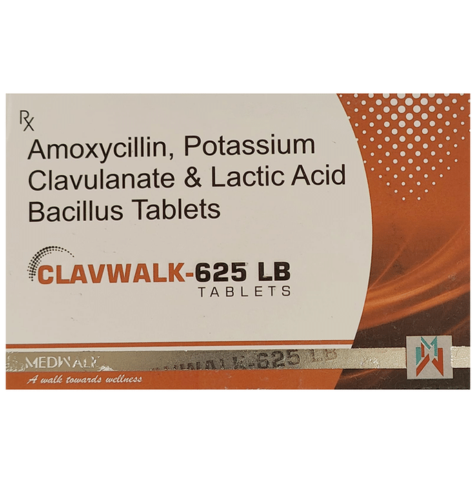 Clavwalk 625 LB Tablet is a combination medicine that is used to treat various types of bacterial infections. It fights against the microorganisms to prevent their growth and further spread of the infection. It also prevents diarrhea which may occur as side effect of this medicine. Clavwalk 625 LB Tablet is a prescription medicine. It is advised to take it as per the prescription. It can be taken with or without food, but it must be taken at a fixed time to ensure better efficacy. Do not consume more than the recommended dose, as this may have harmful effects on your body. If you miss a dose, take it as soon as you remember. The course of the treatment must be completed even if you feel better. Sudden discontinuation of the treatment may affect the potency of the medicine.Some common side effects of this medicine are nausea, vomiting, diarrhea, indigestion, etc. If any of the side effects get aggravated, you must consult your doctor immediately. If you experience any allergic reaction (rashes, itching, swelling, shortness of breath, etc.), you must seek immediate medical help.Before taking this medicine, you should tell your doctor if you are taking any medicines for any health condition. Pregnant or breastfeeding women should also consult with their doctor before taking it. Avoid drinking alcohol as it can cause excessive drowsiness with this medicine. It usually does not impair your ability to drive, but you should not drive if it makes you feel sleepy or dizzy. You must take adequate rest for a faster recovery, also take a healthy diet and drink plenty of water. Your doctor may ask for a few laboratory and diagnostic tests to know the effects of the medicine on your body.