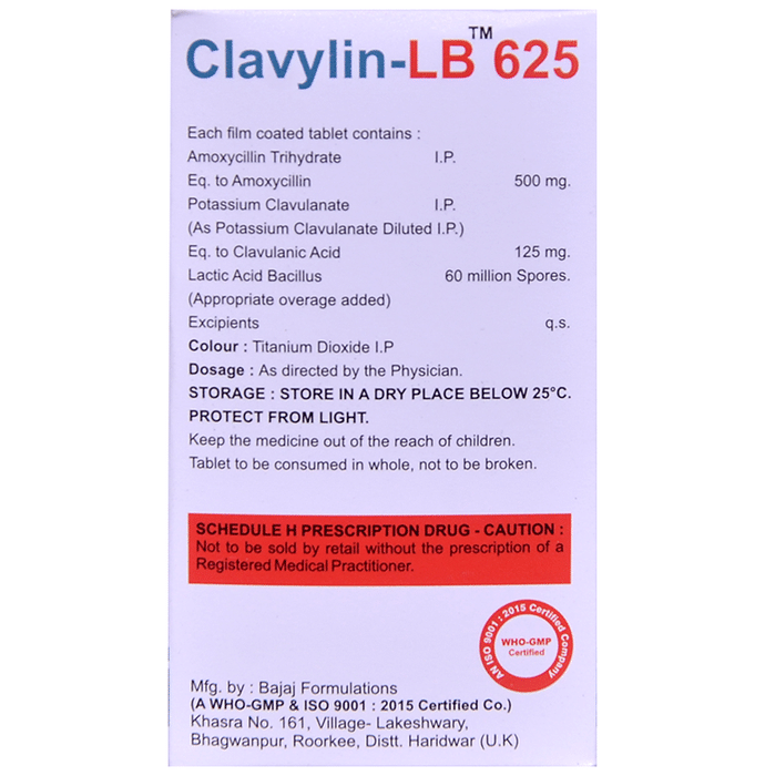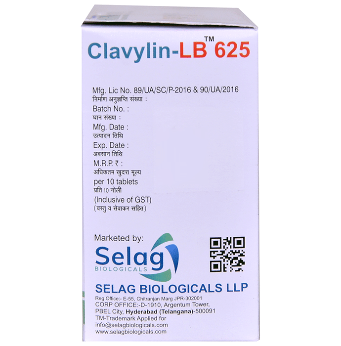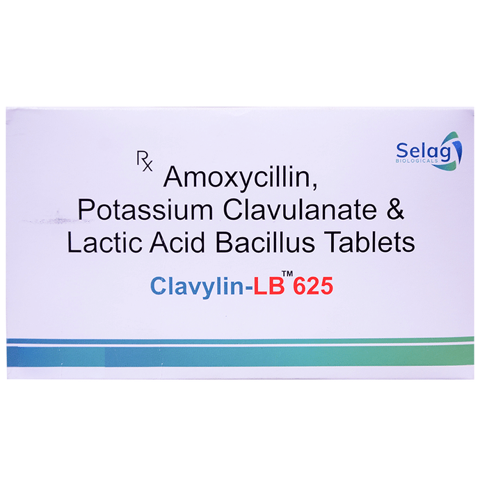 Clavylin-LB 625 Tablet is a combination medicine that is used to treat various types of bacterial infections. It fights against the microorganisms to prevent their growth and further spread of the infection. It also prevents diarrhea which may occur as side effect of this medicine. Clavylin-LB 625 Tablet is a prescription medicine. It is advised to take it as per the prescription. It can be taken with or without food, but it must be taken at a fixed time to ensure better efficacy. Do not consume more than the recommended dose, as this may have harmful effects on your body. If you miss a dose, take it as soon as you remember. The course of the treatment must be completed even if you feel better. Sudden discontinuation of the treatment may affect the potency of the medicine.Some common side effects of this medicine are nausea, vomiting, diarrhea, indigestion, etc. If any of the side effects get aggravated, you must consult your doctor immediately. If you experience any allergic reaction (rashes, itching, swelling, shortness of breath, etc.), you must seek immediate medical help.Before taking this medicine, you should tell your doctor if you are taking any medicines for any health condition. Pregnant or breastfeeding women should also consult with their doctor before taking it. Avoid drinking alcohol as it can cause excessive drowsiness with this medicine. It usually does not impair your ability to drive, but you should not drive if it makes you feel sleepy or dizzy. You must take adequate rest for a faster recovery, also take a healthy diet and drink plenty of water. Your doctor may ask for a few laboratory and diagnostic tests to know the effects of the medicine on your body.