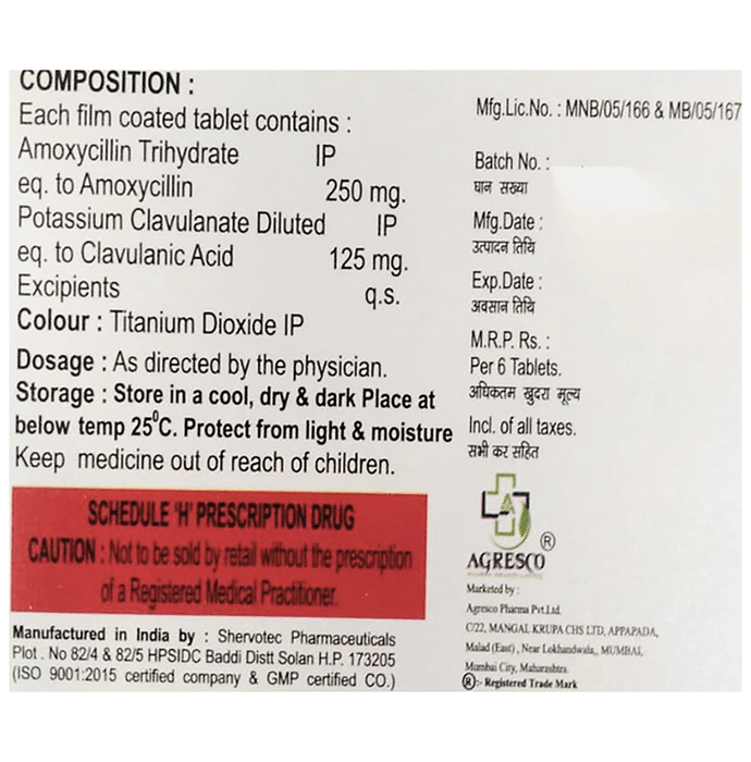 Clecimox 250mg/125mg Tablet is an antibiotic that helps your body fight infections caused by bacteria. It is used to treat infections of the lungs (e.g., pneumonia), ear, nasal sinus, urinary tract, skin, and soft tissue. It will not work for viral infections such as the common cold. Clecimox 250mg/125mg Tablet is best taken with a meal to reduce the chance of a stomach upset. You should take it regularly at evenly spaced intervals as per the schedule prescribed by your doctor. Taking it at the same time daily will help you remember to take it. The dose will depend on what you are being treated for, but you should always complete an entire course of this antibiotic as your doctor prescribes. Please do not stop taking it until you have finished, even when you feel better. If you stop taking it early, some bacteria may survive, and the infection may return or worsen.The most common side effects of Clecimox 250mg/125mg Tablet include nausea, diarrhea, vomiting, fungal infections of the mouth, skin fold or vagina, skin rashes, and vaginitis. These are usually mild, but let your doctor know if they bother you or will not go away.Before taking it, let your doctor know if you are allergic to any antibiotics or have kidney or liver problems. You should also inform your healthcare team about all other medicines you are taking as they may affect or be affected by Clecimox 250mg/125mg Tablet. This medicine is generally considered safe to use during pregnancy and breastfeeding if prescribed by a doctor.