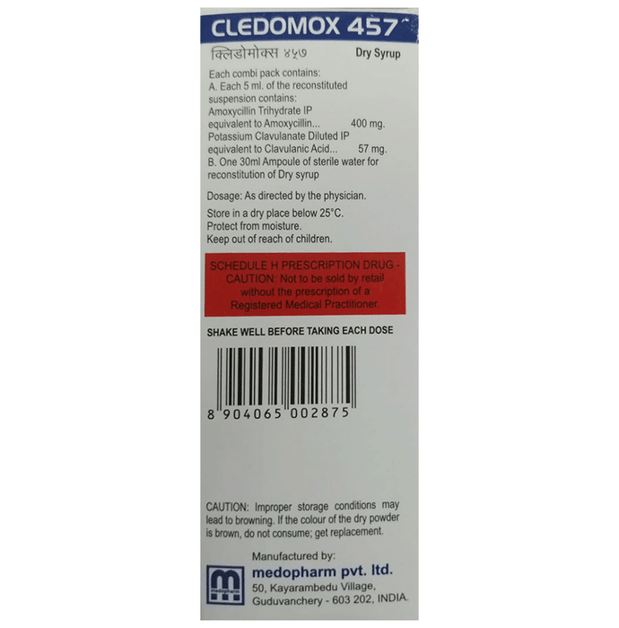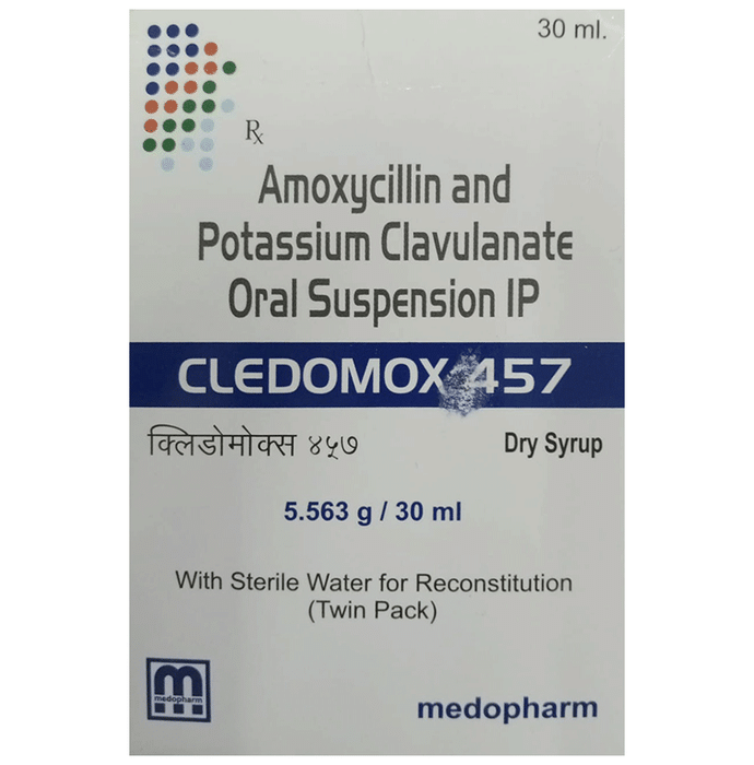 Cledomox 400mg/5ml/57mg/5ml Dry Syrup is an antibiotic medicine that helps treat bacterial infections of the ear, nose, throat, chest, lungs, teeth, skin, and urinary tract. It is capable of killing bacteria that have become resistant to other therapies and thus also helps treat tuberculosis that is resistant to other treatments. You can give Cledomox 400mg/5ml/57mg/5ml Dry Syrup to your child with or without food. It is better to give it with food as that helps increase absorption and decrease the risk of stomach upset. The doctor may prescribe giving it two to three times a day. Medicine dose depends on the severity of the infection, its type, and your child’s body weight and age. So, stick to the dose, time, and way prescribed. If your child vomits the medicine within 30 minutes of intake, let the child calm down and repeat the dose. Do not double dose if it’s the time for the next dose.Cledomox 400mg/5ml/57mg/5ml Dry Syrup may cause vomiting, diarrhea, nausea, abdominal pain, and allergy. These side effects should diminish on their own. But, in case they persist or start bothering your child, you must not delay speaking to your child’s doctor.Share your child’s entire medical history with the doctor, including any previous episode of allergy, heart problem, blood disorder, birth defects, airway obstruction, lung anomaly, gastrointestinal problem, skin disorder, liver impairment, and kidney malfunction. This information will assist the doctor in making dose alterations and for planning your child’s overall treatment.