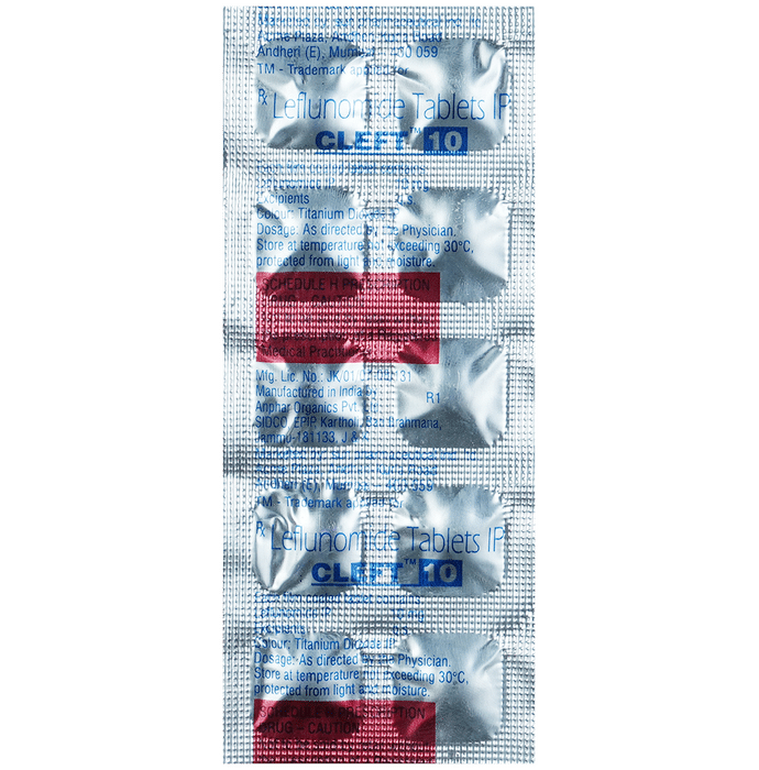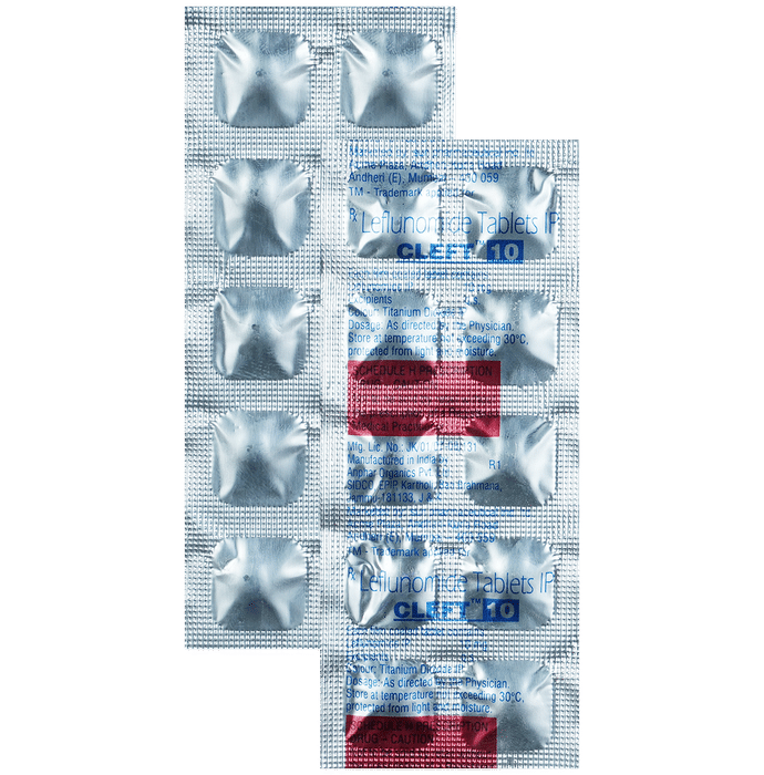 Cleft 10 Tablet is used in the treatment of rheumatoid arthritis and psoriatic arthritis. It helps in slowing down the progression of the disease and provide relief from pain, swelling, and redness. Cleft 10 Tablet can be taken with or without food. You should take it regularly and at the same time each day to get the maximum benefit from it. Keep taking it as recommended by your doctor and complete the dose even if you feel better.Using this medicine may cause some common side effects such as nausea, headache, dyspepsia, rash, diarrhea, and increased liver enzymes. Consult with your doctor if any of these side effects do not go away with time or get worse. Your doctor may help with ways to reduce or prevent these symptoms.To make sure the medicine is safe for you, before taking this medicine, let your doctor know if you have any problems with your heart, kidneys, or liver. Also, tell your doctor of all the other medicines you are taking. Your doctor may recommend regular blood tests to check and make sure the medicine is not harming your liver or effecting your blood counts. Pregnant and breastfeeding mothers should consult with their doctors before taking the medicine.