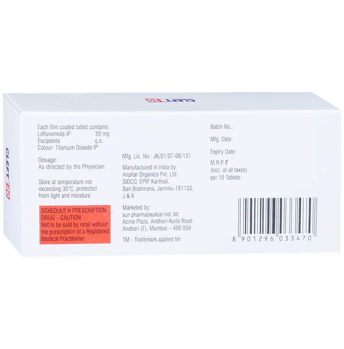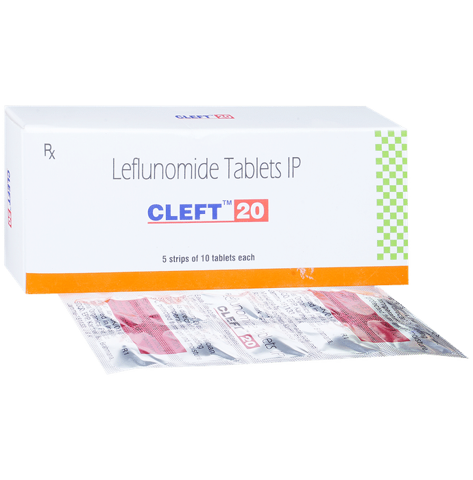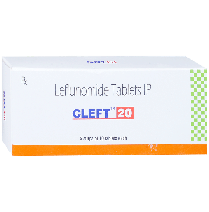 Cleft 20 Tablet is used in the treatment of rheumatoid arthritis and psoriatic arthritis. It helps in slowing down the progression of the disease and provide relief from pain, swelling, and redness. Cleft 20 Tablet can be taken with or without food. You should take it regularly and at the same time each day to get the maximum benefit from it. Keep taking it as recommended by your doctor and complete the dose even if you feel better.Using this medicine may cause some common side effects such as nausea, headache, dyspepsia, rash, diarrhea, and increased liver enzymes. Consult with your doctor if any of these side effects do not go away with time or get worse. Your doctor may help with ways to reduce or prevent these symptoms.To make sure the medicine is safe for you, before taking this medicine, let your doctor know if you have any problems with your heart, kidneys, or liver. Also, tell your doctor of all the other medicines you are taking. Your doctor may recommend regular blood tests to check and make sure the medicine is not harming your liver or effecting your blood counts. Pregnant and breastfeeding mothers should consult with their doctors before taking the medicine.