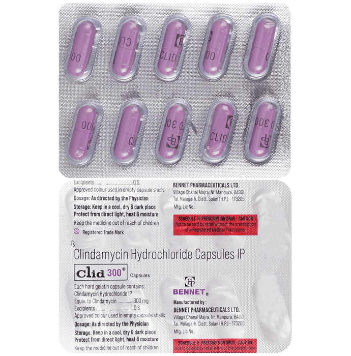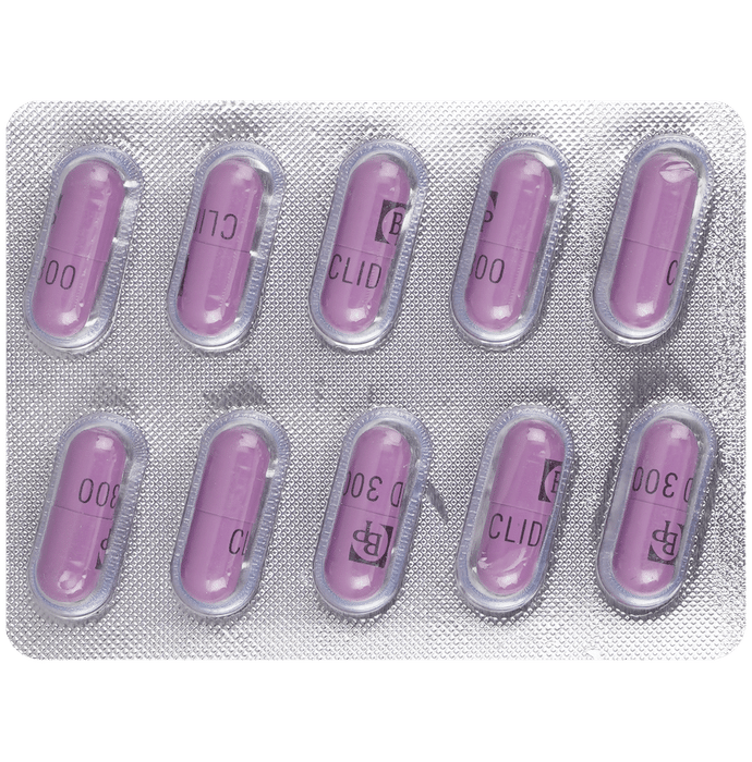 Clid 300mg Capsule is an antibiotic medicine that fights bacteria and is used to treat a variety of bacterial infections. It is effective in infections of the lungs (e.g., pneumonia), throat, stomach, skin and soft tissues, bones and joints, and teeth. Clid 300mg Capsule works by stopping the growth of bacteria. This helps to improve your symptoms and cure the underlying infection. It is best taken with food, take it regularly at evenly spaced intervals as per the schedule prescribed by your doctor. Taking it at the same time every day will help you to remember to take it. Your doctor will decide the correct dose for you. Do not skip any doses and finish the full course of treatment even if you feel better. Stopping the medicine too early may lead to the infection returning or worsening.The most common side effects of this medicine include stomach pain, nausea, vomiting, and diarrhea. These are usually mild but let your doctor know if they bother you or do not go away.Before using it, you should tell your doctor if you have any liver or kidney problems, if you have any problems with your bowels (intestines) or if you have ever had bloody diarrhea caused by taking antibiotics. You should also let your healthcare team know all other medicines you are taking as they may affect, or be affected by this medicine. Pregnant and breastfeeding mothers should consult their doctor before using it.
