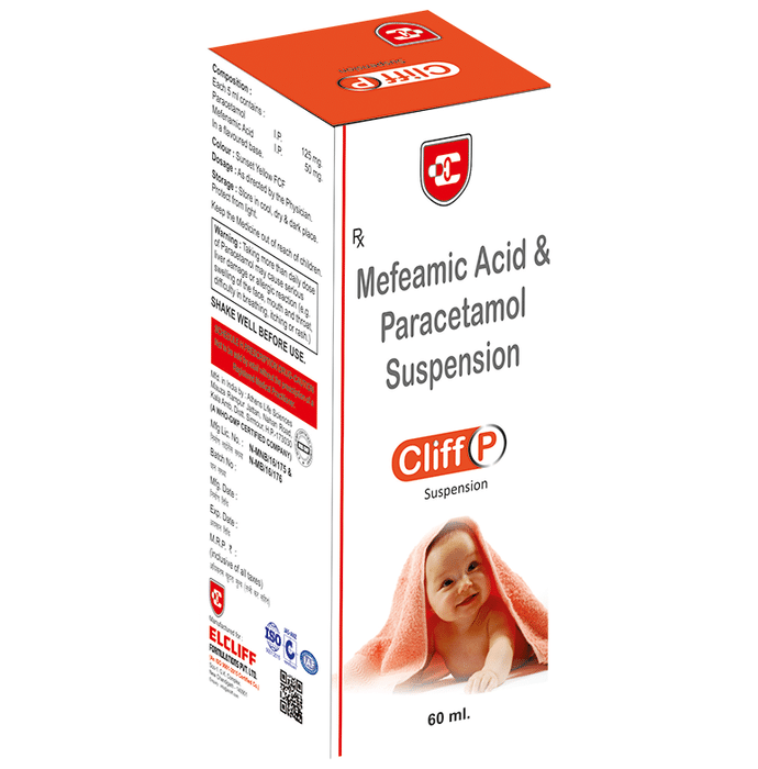 Cliff P Oral Suspension contains two active ingredients both of which belong to a common class of medicines known as non-steroidal anti-inflammatory drugs (NSAIDs). It helps to lower body temperature (fever) and reduce pain and inflammation (redness and swelling) both in infants and children. Adhere to the prescribed dose, time, and way while giving Cliff P Oral Suspension to your child. Give it orally, preferably at a fixed time. It can be given before or after food, but giving it after food helps prevent the chance of developing an upset stomach. If your child vomits within 30 minutes of taking this medicine, give the same dose again. Avoid giving more than the recommended dose for fast relief as that may cause unwanted effects in your child.Some children develop certain mild side effects like nausea, vomiting, stomach pain, heartburn, and diarrhea after taking this medicine. In case your child develops these side effects, do not worry as these are mostly temporary and resolve on their own. But, if these effects persist or become bothersome for your child, do consult your child’s doctor on a priority basis.Before giving Cliff P Oral Suspension to your child, do inform the doctor if your child is allergic to any medicine or products or has a history of any heart problems, birth defects, liver disease, kidney disease, lung disease, or bleeding disorder. This information is critical for dose alteration and helps in planning your child’s overall treatment.