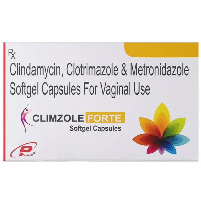 Climzole Forte Softgel Capsule is a combination medicine that is used for the syndromic treatment of vaginal discharge. It fights against the infection by stopping the growth of infection-causing microorganisms. It also prevents further spread of the infection. Climzole Forte Softgel Capsule is to be used as per the label instructions or as suggested by your doctor. This medicine is only for vaginal application. You must wash your hands before and after using it. It is best to use this at bedtime regularly to get the most benefit. If there is any accidental exposure of the medicine to the eyes or mouth, you must wash immediately. For better efficacy of the medicine, the course of the treatment should be completed even if you feel better. Do not use it more than the recommended dose.Climzole Forte Softgel Capsule may lead to a few common side effects like mild irritation and burning sensation at the application site. If these side effects do not improve with time or worsen, inform your doctor. In case of any allergic reactions (rashes, itching, swelling, shortness of breath, etc.), it is advised to call for immediate medical help.Before using it, tell your doctor if you have an underlying disease or are taking medicines for any health condition. The medicines that are used externally usually do not get affected by other medicines, however, you should let your doctor know if you are taking any medicines to ensure safety. Ask your doctor for advice if you are pregnant or breastfeeding. If you are a known allergic to the medicine, you must refrain from using this medicine and consult your doctor. During the course of the treatment, you must follow proper personal hygiene for a faster recovery.