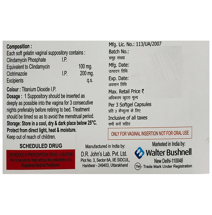 Clindazole Vaginal Suppository is a combination medicine that is prescribed to treat various types of vaginal infections associated with vaginal discharge. It fights against the infection by stopping the growth of infection-causing microorganisms. It also prevents the further spread of the infection. Clindazole Vaginal Suppository is to be used as per the label instructions or as suggested by your doctor. This medicine is only for vaginal application. You must wash your hands before and after using it. It is best to use this at bedtime regularly to get the most benefit. If there is any accidental exposure of the medicine to the eyes or mouth, you must wash it immediately. For better efficacy of the medicine, the course of the treatment should be completed even if you feel better. Do not use it more than the recommended dose.Clindazole Vaginal Suppository may lead to a few common side effects like mild irritation and burning sensation at the application site. If these side effects do not improve with time or worsen, inform your doctor. In case of any allergic reactions (rashes, itching, swelling, shortness of breath, etc.), it is advised to call for immediate medical help.Before using it, tell your doctor if you have an underlying disease or are taking medicines for any health condition. The medicines that are used externally usually do not get affected by other medicines, however, you should let your doctor know if you are taking any medicines to ensure safety. Ask your doctor for advice if you are pregnant or breastfeeding. If you are a known allergic to the medicine, you must refrain from using this medicine and consult your doctor. During the course of the treatment, you must follow proper personal hygiene for a faster recovery.