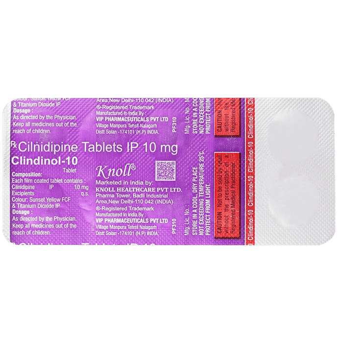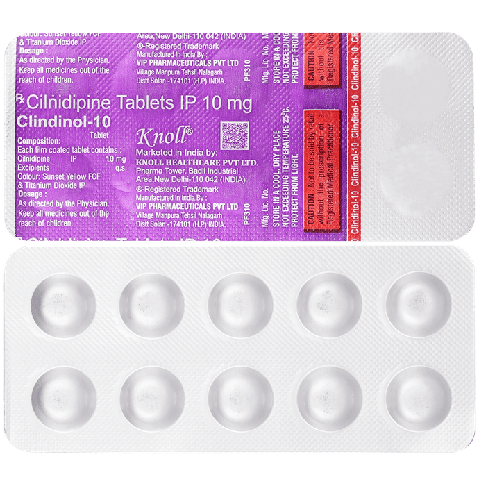 Clindinol 10mg Tablet is a medicine used to treat high blood pressure (hypertension). It belongs to a class of medicines known as a calcium channel blocker which helps to lower blood pressure. This helps prevent heart attacks and strokes. It may also be prescribed to prevent angina (heart-related chest pain). Clindinol 10mg Tablet may be prescribed alone or along with other medicines. The dose depends on the severity of your condition. You can take it at any time of day, with or without food, but it is best to take it at the same time each day. Keep taking it for as long as advised by your doctor. Do not stop this medicine on your own, even if you feel well because high blood pressure often has no symptoms. This makes it hard to identify any sudden spike and if you stop taking it, your condition may get worse.Keeping active with regular exercise, reducing your weight, and eating a healthy diet will also help control your blood pressure. Follow your doctor’s advice while taking this medicine.The most common side effects include fatigue, edema (swelling in the feet), sleepiness, dizziness, flushing, unusual beating of the heart (palpitations), and headache. Consult your doctor if any of these bother you, or do not go away. Side effects like swelling in the feet or ankles and palpitations are lesser in severity than other similar medicines of the group. Studies have shown that it also has a protective effect on the kidneys.Before taking it, let your doctor know if you have any liver, kidney, or heart problems. Pregnant or breastfeeding women should also consult their doctor for advice before taking this medicine. You also need to tell your doctor what other medicines you are taking, especially those used to treat high blood pressure or heart conditions. You should have your blood pressure checked regularly to make sure that this medicine is working properly.