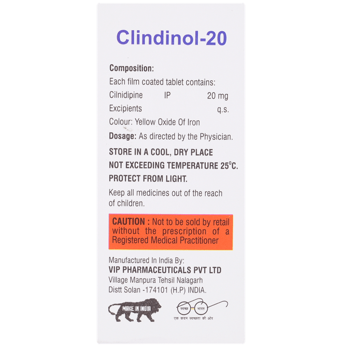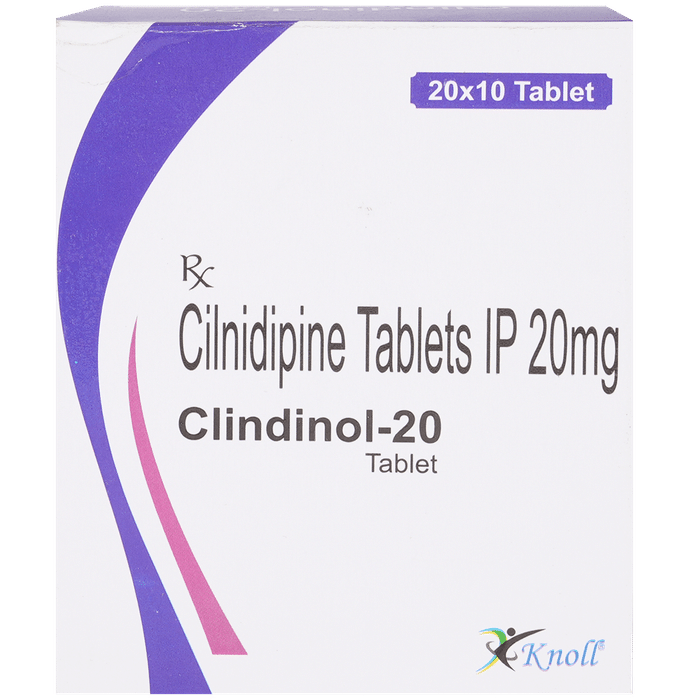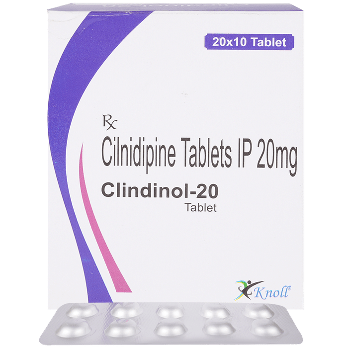 Clindinol 20mg Tablet is a medicine used to treat high blood pressure (hypertension). It belongs to a class of medicines known as a calcium channel blocker which helps to lower blood pressure. This helps prevent heart attacks and strokes. It may also be prescribed to prevent angina (heart-related chest pain). Clindinol 20mg Tablet may be prescribed alone or along with other medicines. The dose depends on the severity of your condition. You can take it at any time of day, with or without food, but it is best to take it at the same time each day. Keep taking it for as long as advised by your doctor. Do not stop this medicine on your own, even if you feel well because high blood pressure often has no symptoms. This makes it hard to identify any sudden spike and if you stop taking it, your condition may get worse.Keeping active with regular exercise, reducing your weight, and eating a healthy diet will also help control your blood pressure. Follow your doctor’s advice while taking this medicine.The most common side effects include fatigue, edema (swelling in the feet), sleepiness, dizziness, flushing, unusual beating of the heart (palpitations), and headache. Consult your doctor if any of these bother you, or do not go away. Side effects like swelling in the feet or ankles and palpitations are lesser in severity than other similar medicines of the group. Studies have shown that it also has a protective effect on the kidneys.Before taking it, let your doctor know if you have any liver, kidney, or heart problems. Pregnant or breastfeeding women should also consult their doctor for advice before taking this medicine. You also need to tell your doctor what other medicines you are taking, especially those used to treat high blood pressure or heart conditions. You should have your blood pressure checked regularly to make sure that this medicine is working properly.