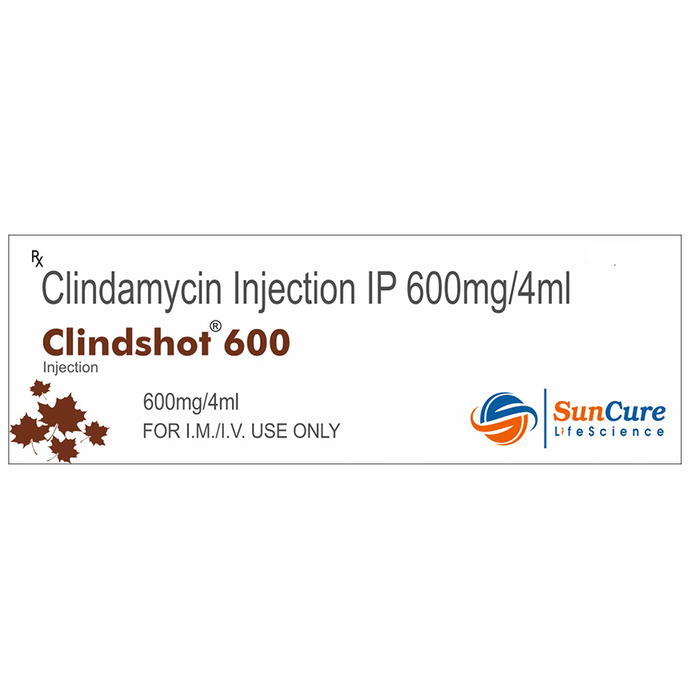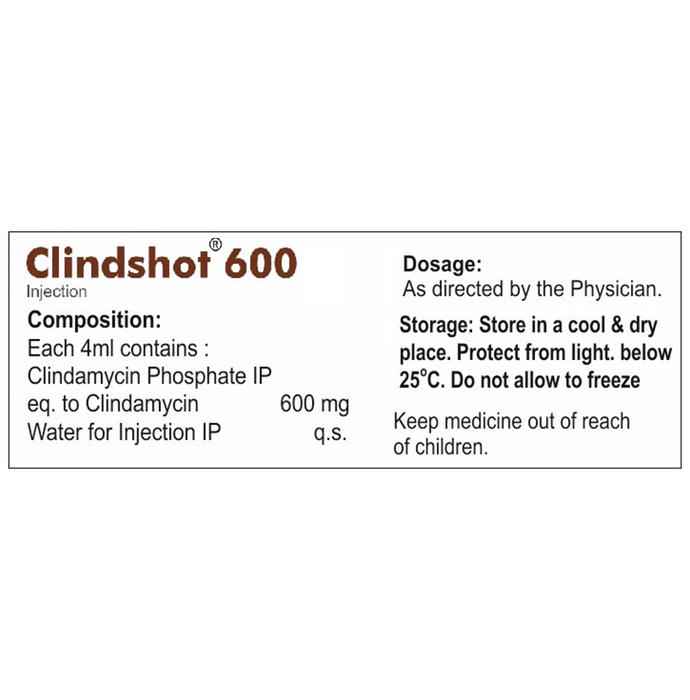 Clindshot 600 Injection is an antibiotic medicine that fights bacteria and is used to treat a wide variety of bacterial infections. It is effective in infections of the lungs (eg. pneumonia), stomach, skin & soft tissues, bones & joints, blood, and heart. Clindshot 600 Injection works by stopping the growth of bacteria. This helps to improve your symptoms and cure the underlying infection. It is given as a drip (intravenous infusion) or as an injection directly into a vein or a muscle under the supervision of a healthcare professional. Your doctor will decide the correct dose for you. You should use this medicine regularly at evenly spaced intervals as per the schedule prescribed by your doctor. Do not skip any doses and finish the full course of treatment even if you feel better. Stopping the medicine too early may lead to the infection returning or worsening.The most common side effects of this medicine include pseudomembranous colitis, diarrhea, abdominal pain, maculopapular rash, thrombophlebitis, and abnormal liver function test. Some people may develop temporary redness or pain at the site of injection; these are usually mild but let your doctor know if they bother you or do not go away.Before using it, you should tell your doctor if you have any liver or kidney problems, if you have any problems with your bowels (intestines) or if you have ever had bloody diarrhea caused by taking antibiotics. You should also let your healthcare team know all other medicines you are taking as they may affect, or be affected by this medicine. Pregnant and breastfeeding mothers should consult their doctor before using it.