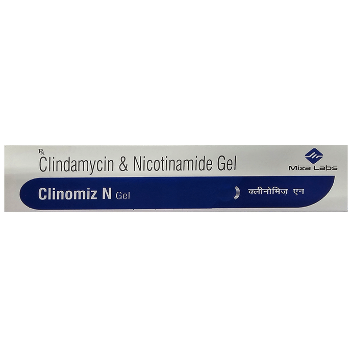 Clinomiz N Gel is a combination medicine that is used to treats acne. It minimizes excessive oil production, thus reduces inflammation. It also prevents the growth of the microorganisms that cause acne. This also helps to prevent pimples, blackheads, and whiteheads on the skin. Clinomiz N Gel is only meant for external use and should be used as advised by your doctor. A thin layer of the medicine should be applied only to the affected areas of the skin with clean and dry hands. Wash your hands before and after applying the medicine. If it gets into your eyes, nose, mouth, or vagina rinse with water. It may take several days to weeks for your symptoms to improve, but you should keep using this medicine regularly. The course of the treatment should be completed to ensure better efficacy of the medicine. If your condition does not improve or gets worse, you should talk to your doctor.This is usually a safe medicine, however, it may cause dryness, peeling, redness, and burning sensation at the application site. These side effects are usually mild and self-limiting. Most of these side effects can be prevented by using a skin moisturizer and drinking plenty of water. Serious side effects are rare. You must consult the doctor if you experience any allergic reaction (rashes, itching, swelling, shortness of breath, etc.).Before using this medicine, it is important to tell your doctor if you are taking or have recently taken any other medicines for the same disease or other diseases. Pregnant and breastfeeding women should use this medicine with proper consultation and caution. If you are a known allergic to the medicine, you must refrain from using this medicine and consult your doctor. During the course of the treatment, do not touch, prick or scratch the infected skin areas as this may worsen or spread the acne. Avoid unnecessary sun exposure and use a sunscreen before stepping out in the sun. It is also advised, not to receive any cosmetic procedures without asking your doctor.