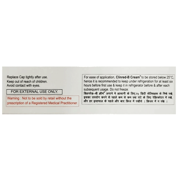 Clinred B 2.5% Cream is a combination of medicines that are used to treat acne. It kills the bacteria which cause acne. It also reduces oil production and replenishes the skin. Clinred B 2.5% Cream should be used in the dose and duration as advised by your doctor. It is for external use only. Wash your hands before using this medicine. Apply only on the affected areas of the skin. It is advised to check the label for directions before use. The most common side effects include skin peeling, redness, dry skin and burning and sensation at the application site.If this side effect persist for a longer duration, inform your doctor. In case by accident, this medicine goes into your eyes, ears, nose or mouth, immediately rinse it with water. Inform your doctor if you notice darkening or discoloration, or severe burning sensation at the treated skin.Inform your doctor if you have known allergies from this medicine. If you are pregnant or suffering from any other condition, please inform your doctor. This medicine is safe to use in breastfeeding mothers.