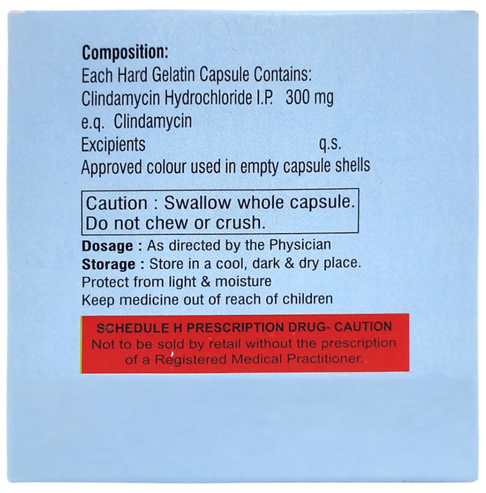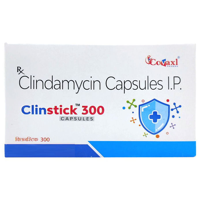 Clinstick 300 Capsule is an antibiotic medicine that fights bacteria and is used to treat a variety of bacterial infections. It is effective in infections of the lungs (e.g., pneumonia), throat, stomach, skin and soft tissues, bones and joints, and teeth. Clinstick 300 Capsule works by stopping the growth of bacteria. This helps to improve your symptoms and cure the underlying infection. It is best taken with food, take it regularly at evenly spaced intervals as per the schedule prescribed by your doctor. Taking it at the same time every day will help you to remember to take it. Your doctor will decide the correct dose for you. Do not skip any doses and finish the full course of treatment even if you feel better. Stopping the medicine too early may lead to the infection returning or worsening.The most common side effects of this medicine include stomach pain, nausea, vomiting, and diarrhea. These are usually mild but let your doctor know if they bother you or do not go away.Before using it, you should tell your doctor if you have any liver or kidney problems, if you have any problems with your bowels (intestines) or if you have ever had bloody diarrhea caused by taking antibiotics. You should also let your healthcare team know all other medicines you are taking as they may affect, or be affected by this medicine. Pregnant and breastfeeding mothers should consult their doctor before using it.