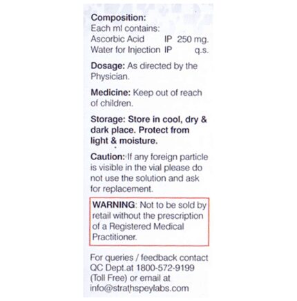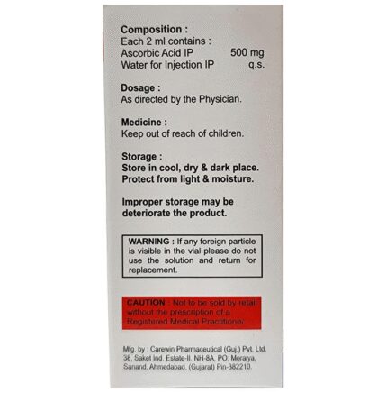 In Vitamin C deficiency Ascorvit-C Injection is a supplement of vitamin C. It is used in the treatment of conditions caused due to low levels of vitamin C in the body. Benefits of vitamin C include immunity boost, protection against cardiovascular disease, prenatal health problems, eye disease, and skin wrinkling. Take it in the exact dose and duration as prescribed by your doctor for maximum benefits.