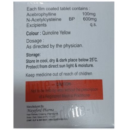 Acedrite-N Tablet is used to treat and prevent asthma and symptoms of chronic obstructive pulmonary disorder (a lung disorder in which the flow of air to the lungs is blocked) such as coughing, wheezing, and shortness of breath. It helps relax the muscles of the air passages thereby making it easier to breathe. Acedrite-N Tablet is taken with or without food in a dose and duration as advised by the doctor. The dose you are given will depend on your condition and how you respond to the medicine. You should keep taking this medicine for as long as your doctor recommends. If you stop treatment too early your symptoms may come back and your condition may worsen. Let your healthcare team know about all other medications you are taking as some may affect, or be affected by this medicine.The most common side effects are vomiting, heartburn, stomach upset, rash, itching, and nasal inflammation. Most of these are temporary and usually resolve with time. Contact your doctor straight away if you are at all concerned about any of these side effects. Avoid drinking alcohol while taking this medicine as that may cause excessive drowsiness.Never support self-medication or recommend your medicine to another person. Before you start taking this medicine it is important to inform your doctor if you are suffering from liver or kidney disease. You should also tell your doctor if you are pregnant, planning pregnancy, or breastfeeding.
