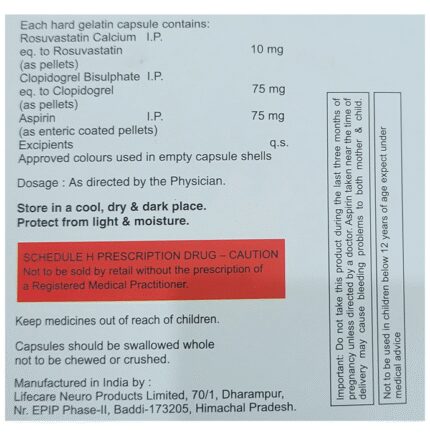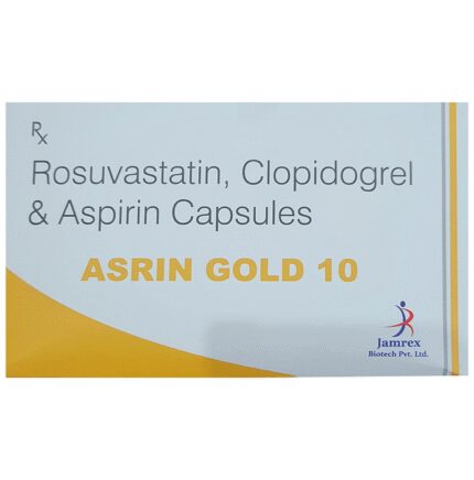 In Prevention of Heart attack Asrin Gold 10 Capsule is a combination medicine that is used to prevent heart attack. It contains Rosuvastatin that works by reducing the amount of “bad” cholesterol (LDL) and raising the amount of “good” cholesterol (HDL) in your blood. High levels of cholesterol can cause your blood vessels to narrow (atherosclerosis). Lowering the amount of cholesterol reduces the chances of heart diseases and helps you remain healthier for longer. u003cbr>u003cbr>Besides, it also contains two blood thinners, Aspirin and Clopidogrel, that together prevent the formation of blood clots and also prevent the existing ones from growing bigger in size. Take it regularly and make appropriate lifestyle changes (such as eating healthy and staying active) to maximize the effectiveness of this medicine. Keep taking it even if you feel well.