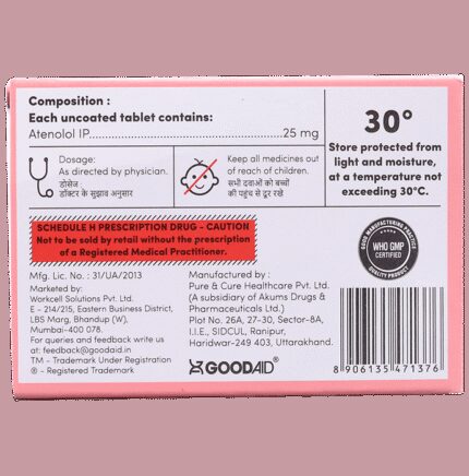 In Treatment of Angina (heart-related chest pain) Ateaid 25 Tablet relaxes the blood vessels so that blood can flow more easily around your body and makes sure that your heart is getting a good supply of oxygen. This makes it less likely that you will suffer chest pain caused by angina. This medicine can help increase your ability to exercise and go about your daily life more easily by reducing the frequency of angina attacks. You should take it regularly and as long as it is prescribed for it to work effectively.
