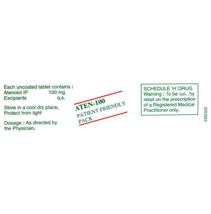 In Treatment of Angina (heart-related chest pain) Aten 100 Tablet relaxes the blood vessels so that blood can flow more easily around your body and makes sure that your heart is getting a good supply of oxygen. This makes it less likely that you will suffer chest pain caused by angina. This medicine can help increase your ability to exercise and go about your daily life more easily by reducing the frequency of angina attacks. You should take it regularly and as long as it is prescribed for it to work effectively.