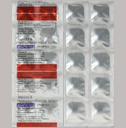 In Hypertension (high blood pressure) Aten-H 12.5 Tablet blocks the effects of some chemicals on your heart and blood vessels. This slows down your heart rate and helps the heart beat with less force. Additionally, it eliminates excess water from the body and increases urine output. This lowers your blood pressure and reduces your risk of having a stroke, a heart attack, or kidney problems in the future. You do not usually feel any direct benefit from taking this medicine, but it works in the long term to keep you well. You should take it regularly as prescribed for this medicine to be most effective, even if you feel better.