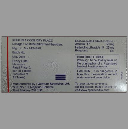 In Hypertension (high blood pressure) Aten-H 25 Tablet blocks the effects of some chemicals on your heart and blood vessels. This slows down your heart rate and helps the heart beat with less force. Additionally, it eliminates excess water from the body and increases urine output. This lowers your blood pressure and reduces your risk of having a stroke, a heart attack, or kidney problems in the future. You do not usually feel any direct benefit from taking this medicine, but it works in the long term to keep you well. You should take it regularly as prescribed for this medicine to be most effective, even if you feel better.