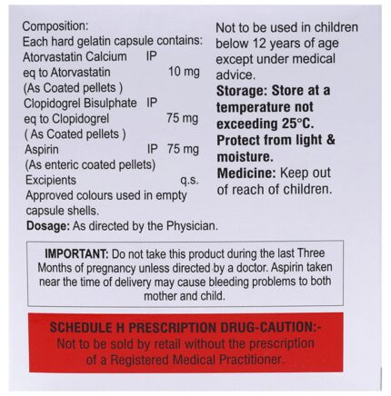 In Prevention of Heart attack Atoer Gold 10 Capsule is a combination medicine that is used to prevent heart attack. It contains Atorvastatin that works by reducing the amount of “bad” cholesterol (LDL) and raising the amount of “good” cholesterol (HDL) in your blood. High levels of cholesterol can cause your blood vessels to narrow (atherosclerosis). Lowering the amount of cholesterol reduces the chances of heart diseases and helps you remain healthier for longer.u003cbr>u003cbr>Besides, it also contains two blood thinners, Aspirin and Clopidogrel, that together prevent the formation of blood clots and also prevent the existing ones from growing bigger in size. Take it regularly and make appropriate lifestyle changes (such as eating healthy and staying active) to maximize the effectiveness of this medicine. Keep taking it even if you feel well.