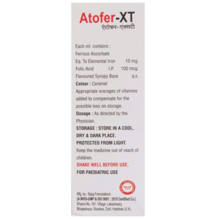In Treatment of Iron deficiency Iron deficiency is a condition in which your body lacks iron leading to a condition called anemia. This can result in symptoms that can affect your quality of life. These include shortness of breath, tiredness, reduced concentration, pale or yellow skin, brittle nails, etc. Atofer XT Oral Suspension helps treat as well as prevent iron deficiency by improving the level of iron in your body. Along with taking Atofer XT Oral Suspension, include iron-rich foods like spinach, dates, organ meats like liver, iron-fortified cereals, etc.