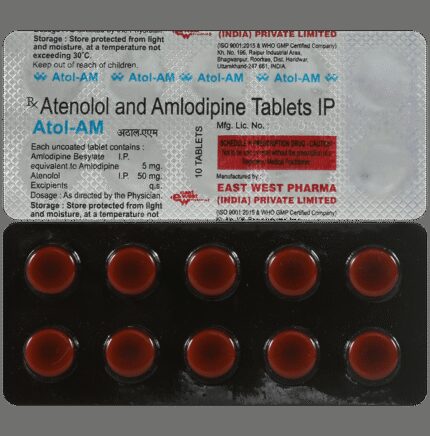 In Treatment of Hypertension (high blood pressure) Atol AM Tablet is a combination medicine that contains two active ingredients, Amlodipine and Atenolol. Both of the medicines in this combination work to lower blood pressure but in different ways. Together they help to relax blood vessels, reduce heart rate and make it easier for your heart to pump blood around your body. This lowers blood pressure. u003cbr>u003cbr>If your blood pressure is controlled you are less at risk of having a heart attack, stroke or kidney problems. The medicine must be taken regularly as prescribed to be effective. You do not usually feel any direct benefit from taking this medicine, but it works in the long term to keep you well. You should also make appropriate lifestyle changes (such as eating healthy and staying active) to maximize the effectiveness of this medicine.