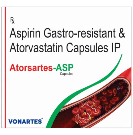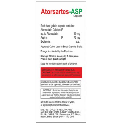 In Treatment of Prevention of heart attack and stroke Atorsartes-ASP Capsule is a combination medicine that is used to prevent heart attack. It contains Atorvastatin that works by reducing the amount of “bad” cholesterol (LDL) and raising the amount of “good” cholesterol (HDL) in your blood. High levels of cholesterol can cause your blood vessels to narrow (atherosclerosis). Lowering the amount of cholesterol reduces the chances of heart diseases and stroke and helps you remain healthier for longer. u003cbr>u003cbr>Besides, it also contains a blood thinner, Aspirin, that prevents the formation of blood clots and also prevents the existing ones from growing bigger in size. Take it regularly and make appropriate lifestyle changes (such as eating healthy and staying active) to maximize the effectiveness of this medicine. Keep taking it even if you feel well.