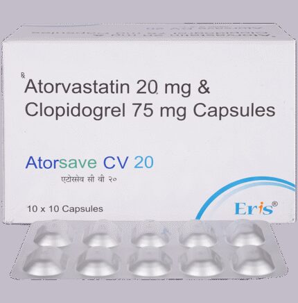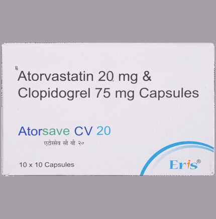In Heart attack prevention and high cholesterol Atorsave CV 20 Capsule is a combination medicine that is used to prevent heart attack. It contains Atorvastatin that works by reducing the amount of “bad” cholesterol (LDL) and raising the amount of “good” cholesterol (HDL) in your blood. High levels of cholesterol can cause your blood vessels to narrow (atherosclerosis). Lowering the amount of cholesterol reduces the chances of heart diseases and helps you remain healthier for longer. u003cbr>Besides, it also contains a blood thinner, Clopidogrel, that prevents the formation of blood clots and also prevents the existing ones from growing bigger in size. Take it regularly and make appropriate lifestyle changes (such as eating healthy and staying active) to maximize the effectiveness of this medicine. Keep taking it even if you feel well.