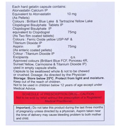 In Prevention of Heart attack Atorsave Gold 75mg/10mg/75mg Capsule is a combination medicine that is used to prevent heart attack. It contains Atorvastatin that works by reducing the amount of “bad” cholesterol (LDL) and raising the amount of “good” cholesterol (HDL) in your blood. High levels of cholesterol can cause your blood vessels to narrow (atherosclerosis). Lowering the amount of cholesterol reduces the chances of heart diseases and helps you remain healthier for longer.u003cbr>u003cbr>Besides, it also contains two blood thinners, Aspirin and Clopidogrel, that together prevent the formation of blood clots and also prevent the existing ones from growing bigger in size. Take it regularly and make appropriate lifestyle changes (such as eating healthy and staying active) to maximize the effectiveness of this medicine. Keep taking it even if you feel well.