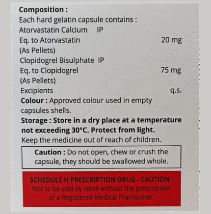 In Heart attack prevention and high cholesterol Atorvastat-CV20 Capsule is a combination medicine that is used to prevent heart attack. It contains Atorvastatin that works by reducing the amount of “bad” cholesterol (LDL) and raising the amount of “good” cholesterol (HDL) in your blood. High levels of cholesterol can cause your blood vessels to narrow (atherosclerosis). Lowering the amount of cholesterol reduces the chances of heart diseases and helps you remain healthier for longer. u003cbr>Besides, it also contains a blood thinner, Clopidogrel, that prevents the formation of blood clots and also prevents the existing ones from growing bigger in size. Take it regularly and make appropriate lifestyle changes (such as eating healthy and staying active) to maximize the effectiveness of this medicine. Keep taking it even if you feel well.